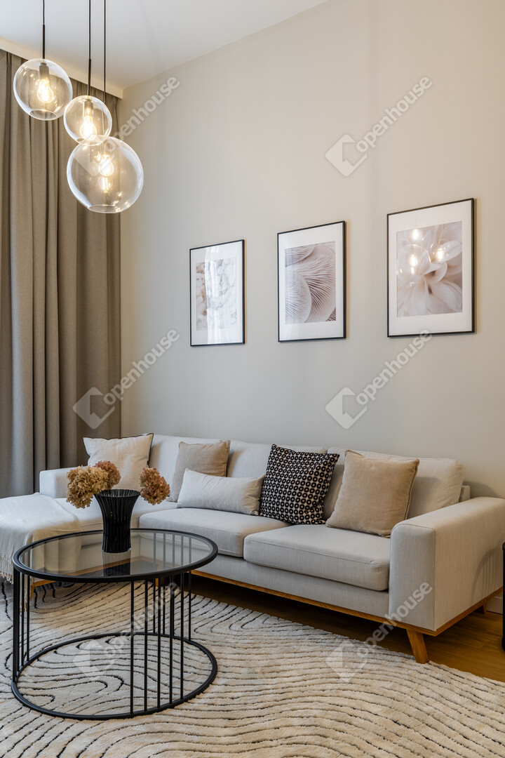 The living room is bright and airy, enhanced by large windows and a balanced palette of soft, neutral tones.
