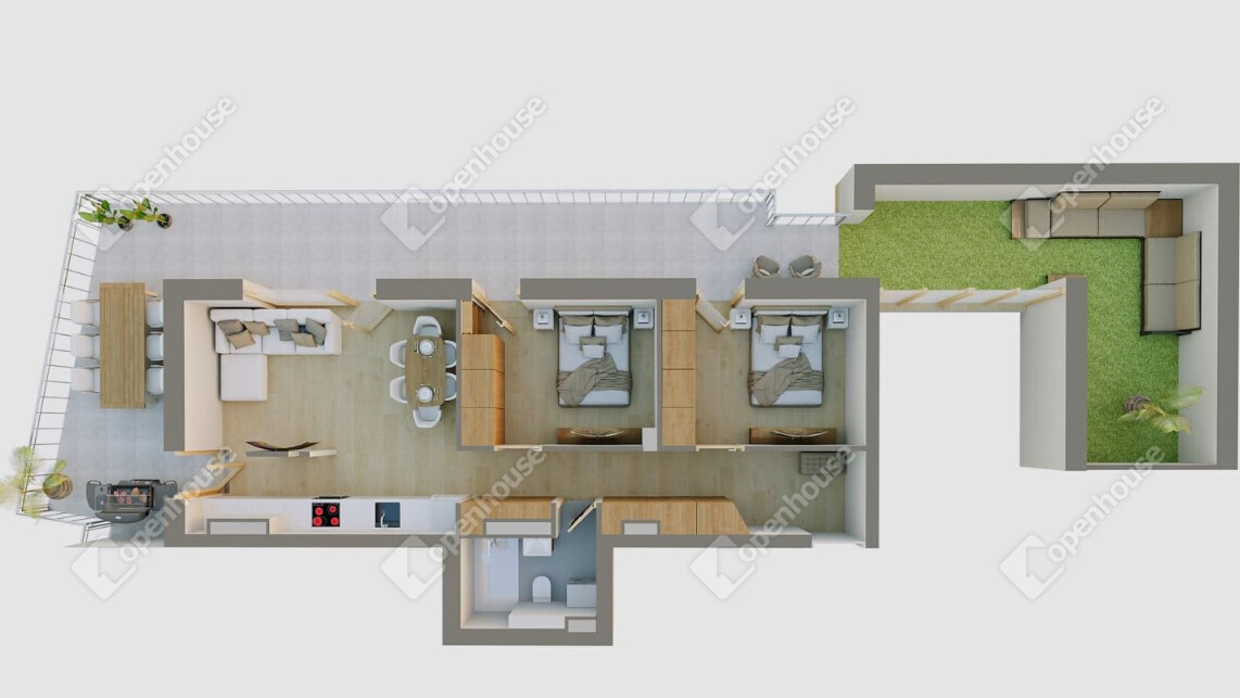 - Ebben a lakásban a nappalinak és a hálószobáknak is van közvetlen terasz kapcsolata. A nappalihoz közvetlenül kapcsolódik a konyha és az étkező. Minden konyha egyedileg kialakított szag elszívó bekötéssel rendelkezik.