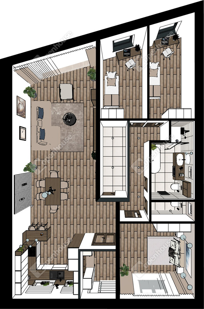 - Private 420 m2 garden connection – terrace, relaxation area, greenery