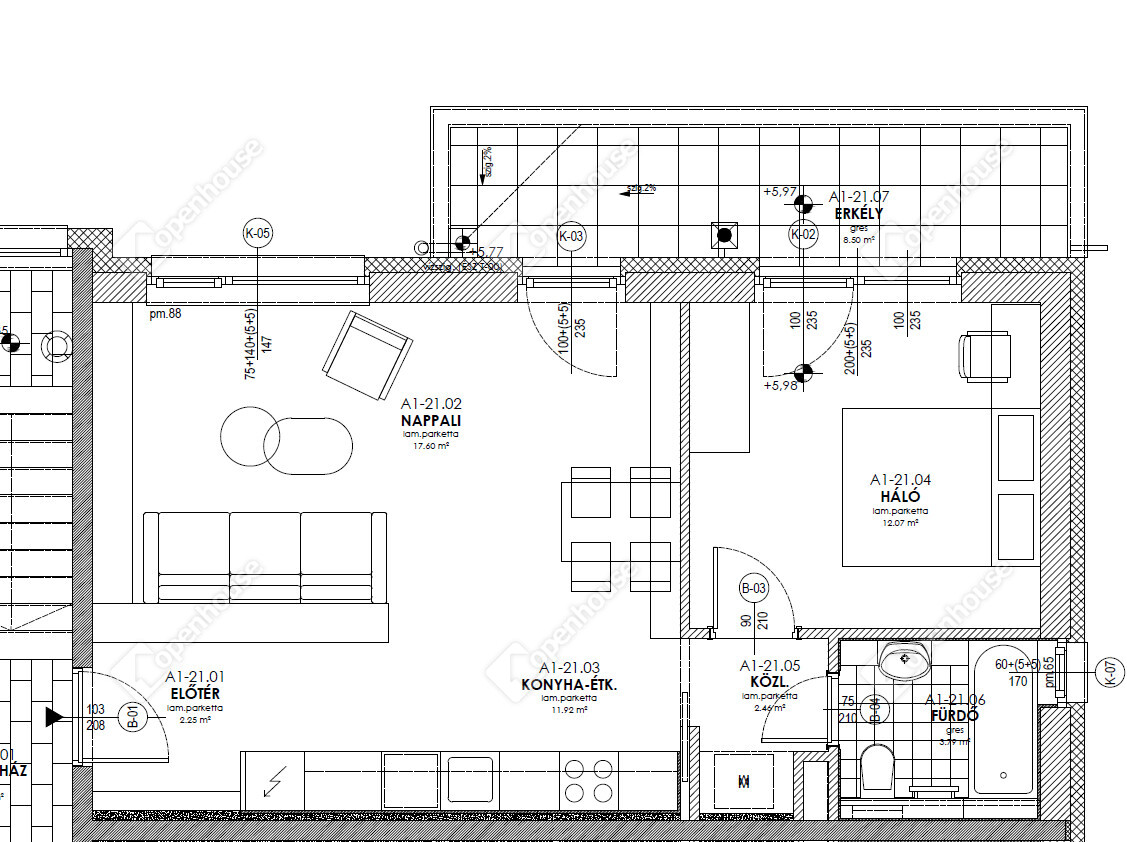 A1-21 jelű lakás 50,09 m2 alapterületű, és egy 8,5 m2 erkély tartozik hozzá