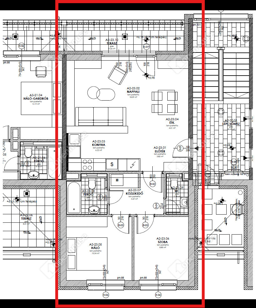 A2-23 jelű lakás 63,23 m2 alapterületű, 9,2 m2 terasz tartozik hozzá