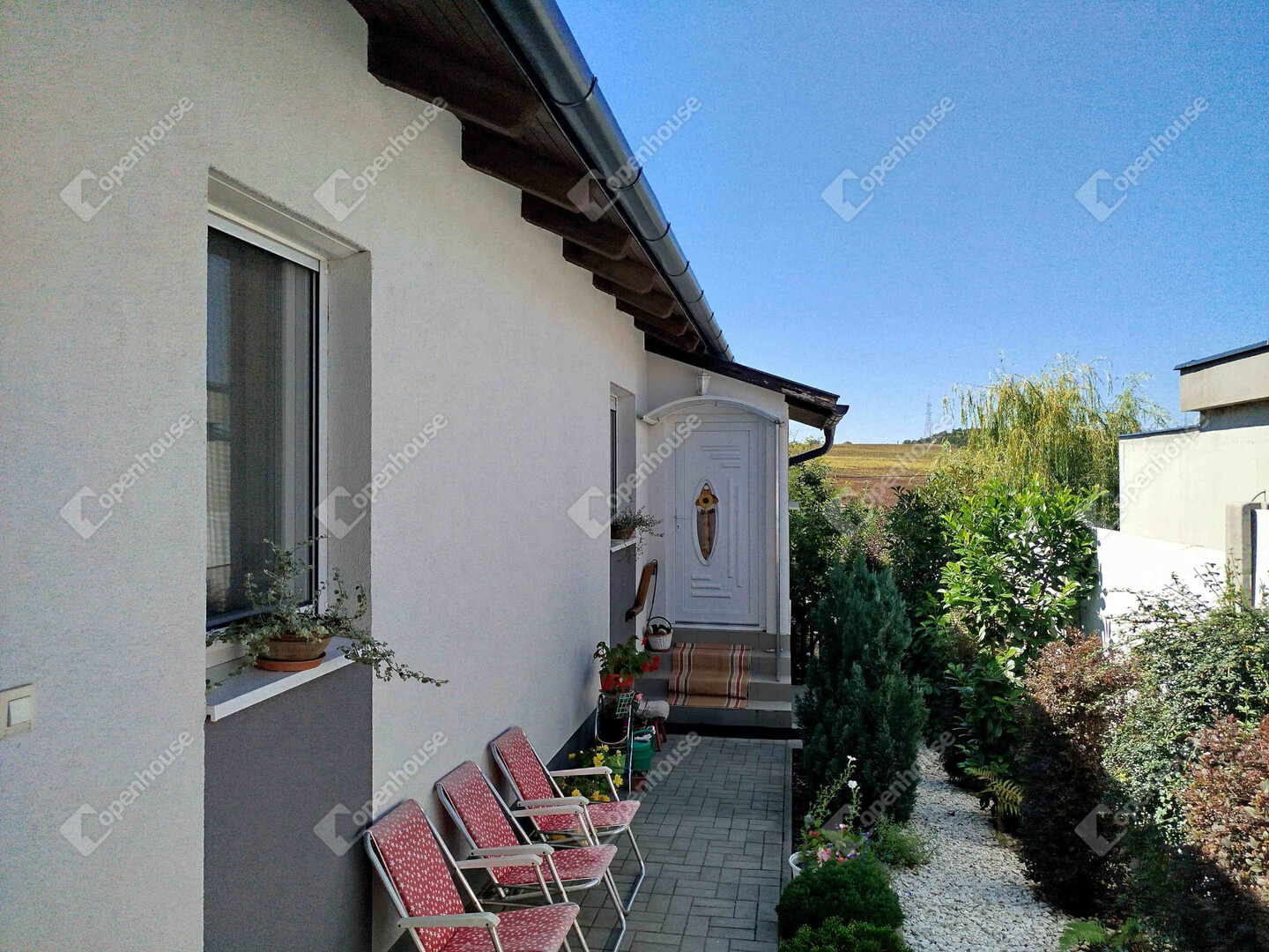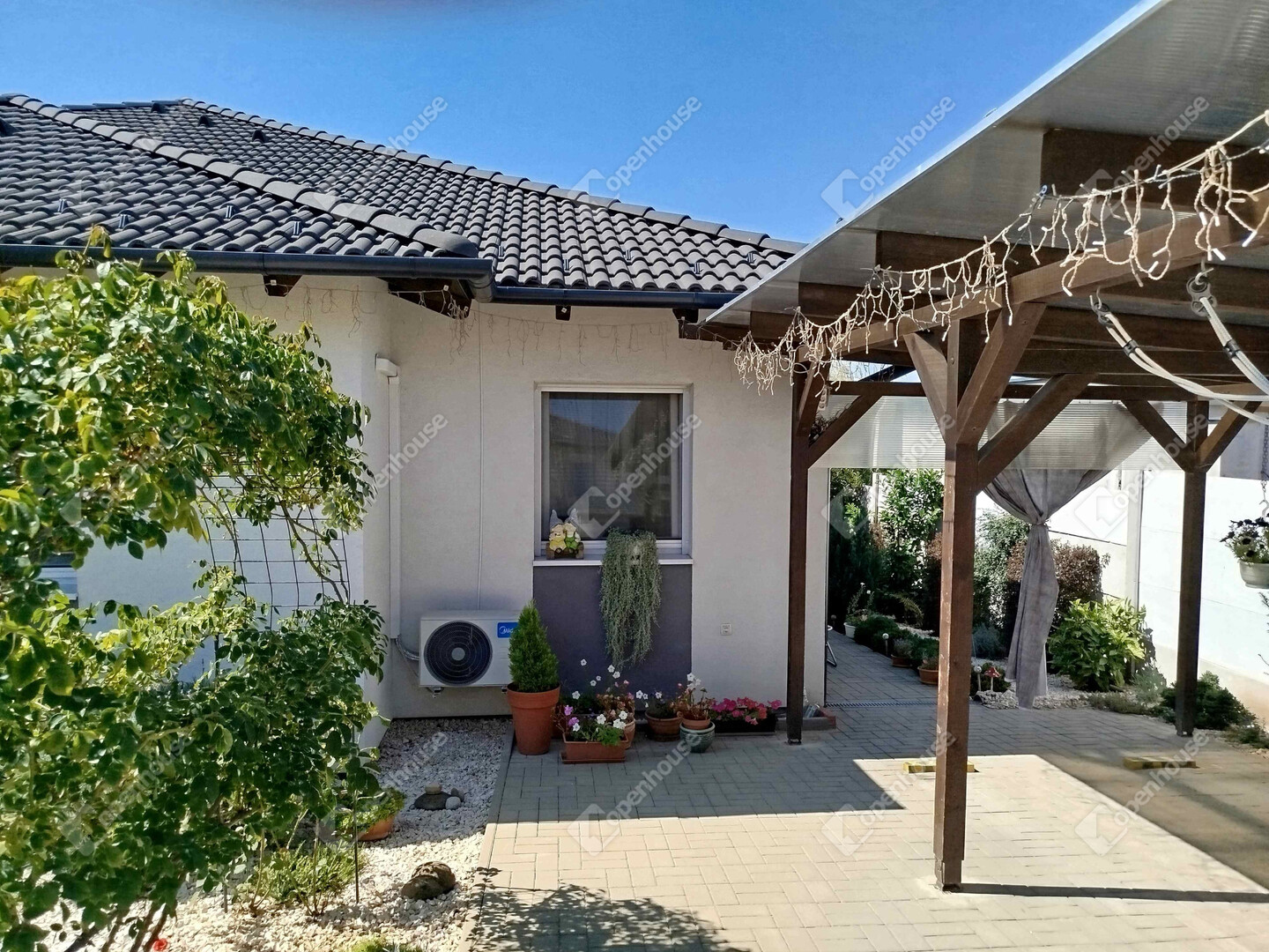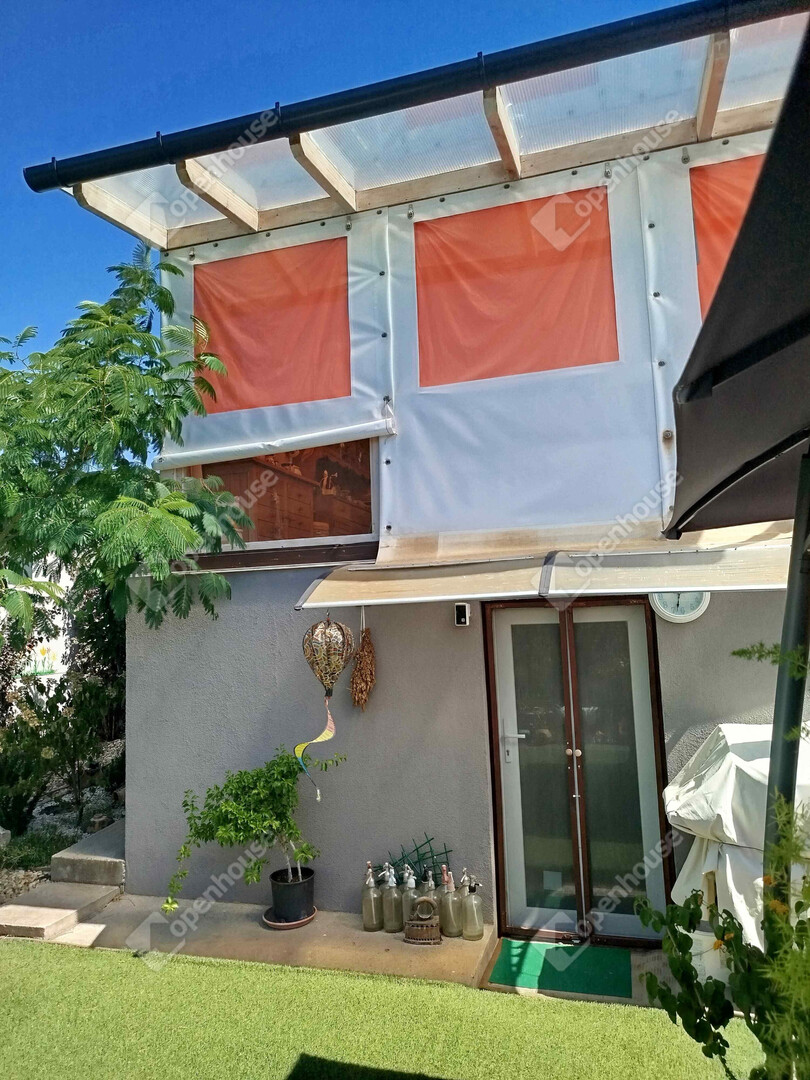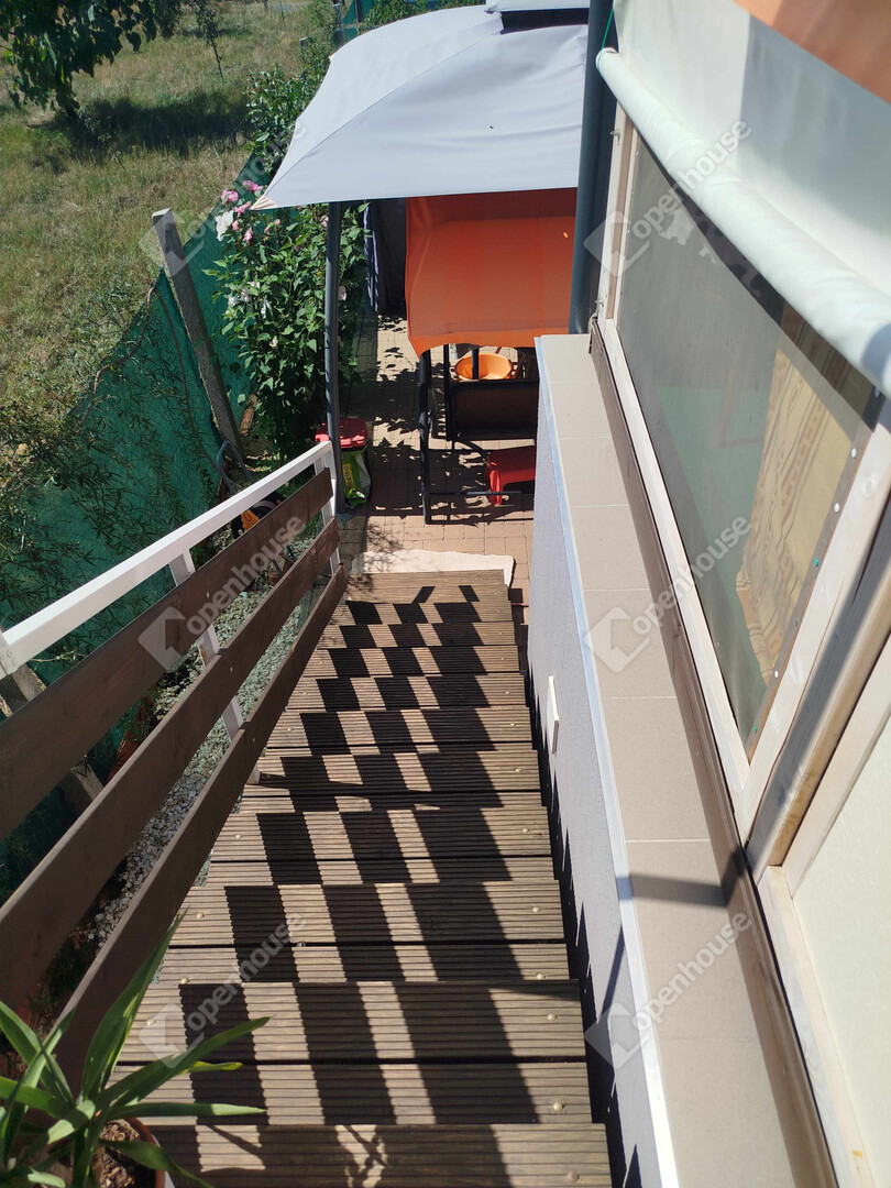 A 94 m2 közvetlen lakótérhez tartozik egy nappaliból nyíló 18 m2-es terasz, ahol a nyári estéket kellemesen töltheti el a friss levegőn. A teraszról lépcsősor vezet le a kertbe, ahol egy kényelmes könnyű előtető alatt a pihenéstől a bográcsozásig bármilyen szabadidős tevékenység választható. Az előtető mellett - a terasz alatt zárható ajtóval egy szintén 18 m2-es pincerész van, amely a tárolástól kezdve akár a kerti konyha szerepét is betöltheti, lévén vízcsap, mosogatótálca és lefolyó itt is található.