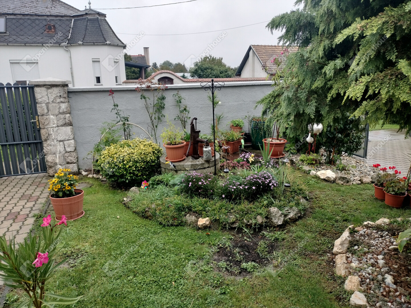 A nagy méretű terasz alatt pince található. Az udvar rendezett, parkosított és térkövezett, ahol kis játszótér, sziklakert és kút is helyet kapott.