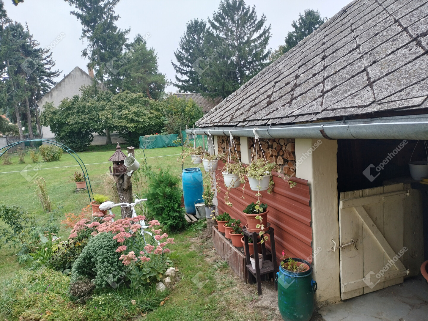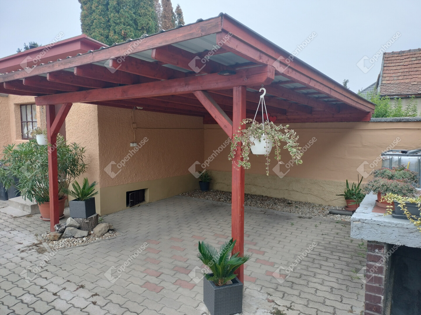 Az ingatlanhoz tartozik egy önálló, nagy méretű garázs, valamint egy fedett autóbeálló is. Az öntözést esővízgyűjtő segíti.