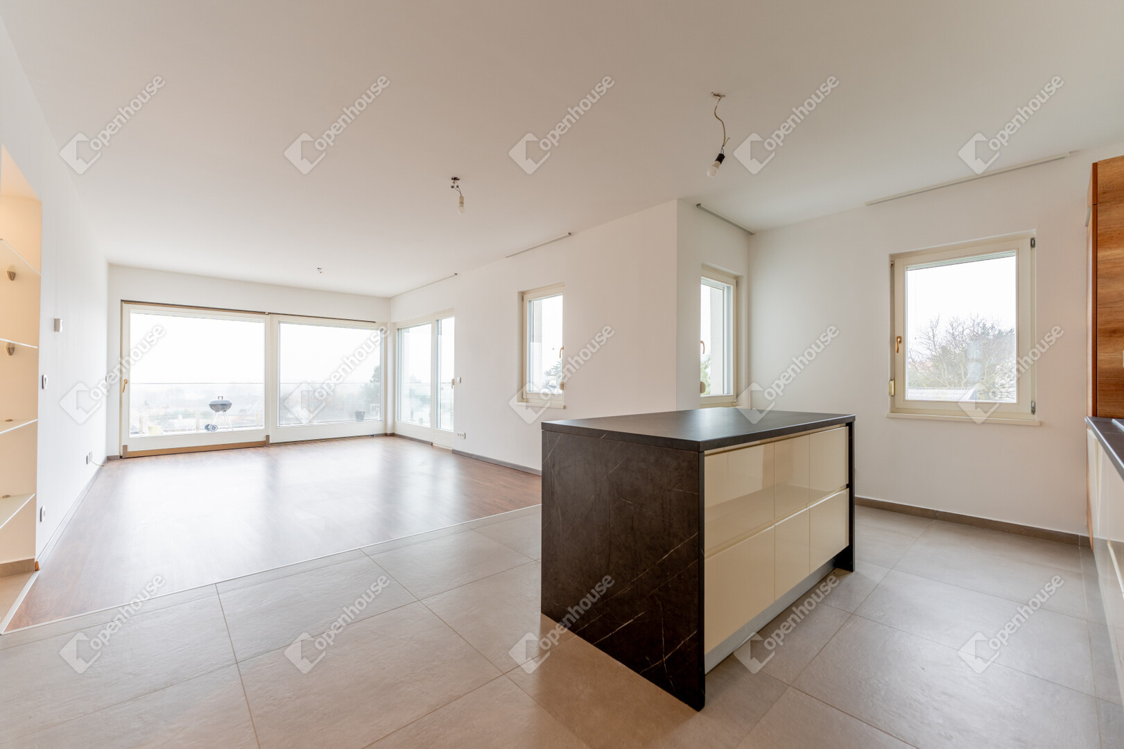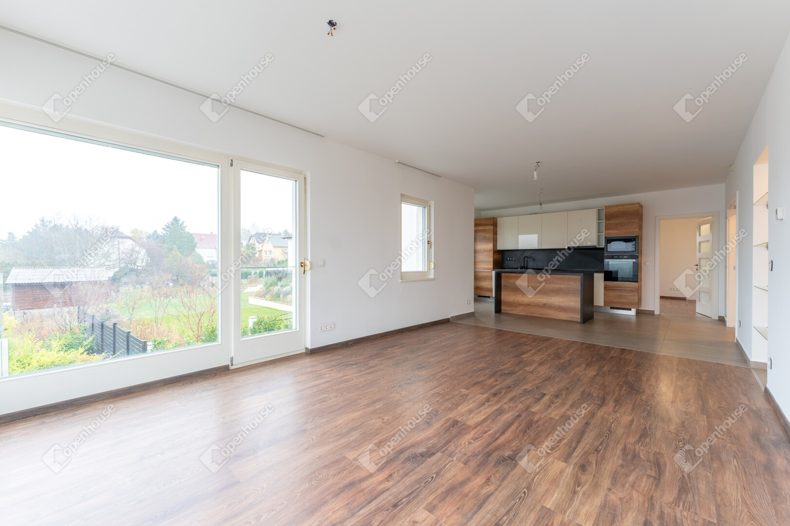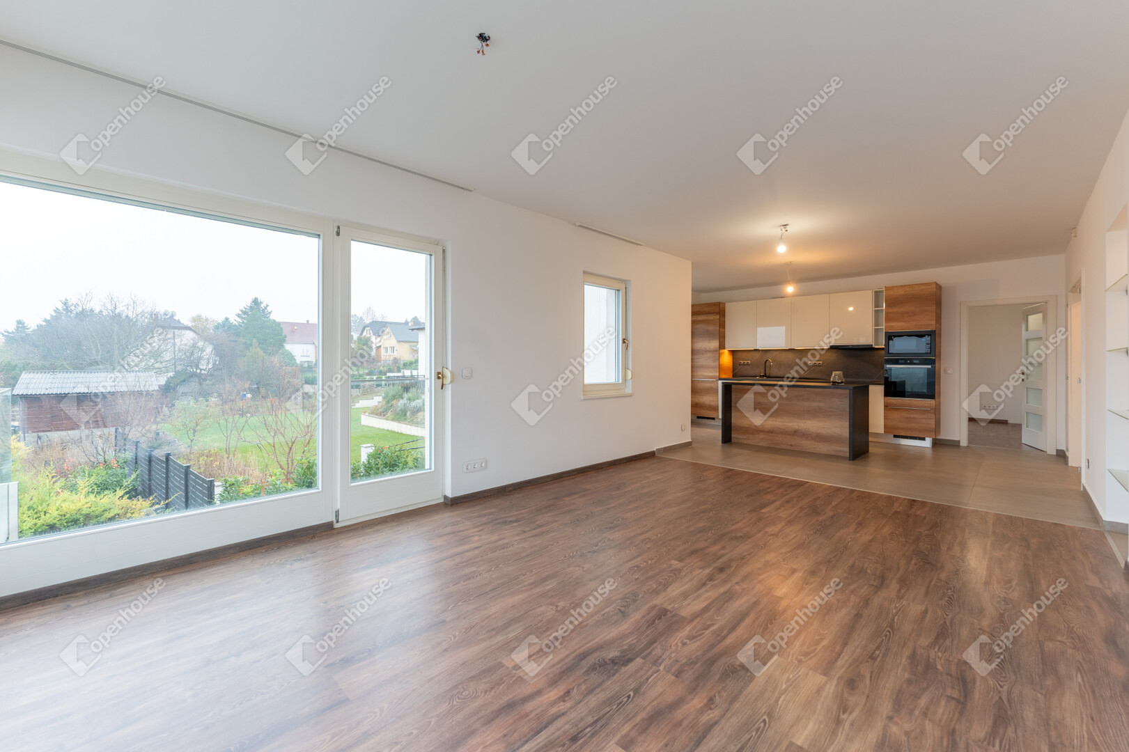 A tágas, egybenyitott nappali–étkező–konyha térben hatalmas üvegfelületek engedik be a fényt, így a lakás egész nap napfényben úszik.