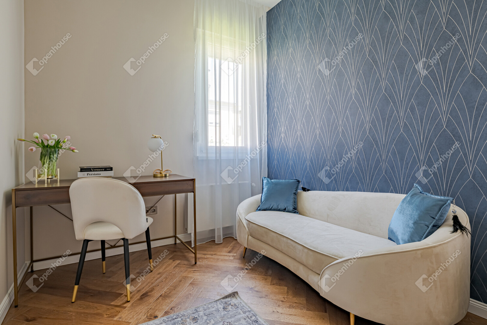 A másik két hálószoba eltérő hangulatot képvisel: az egyik mélykék tapétája elegáns kontrasztot ad, a másik világos tónusaival a nyitottság érzetét kelti. Közös bennük a jó arány, a természetes fény és az otthonos harmónia.