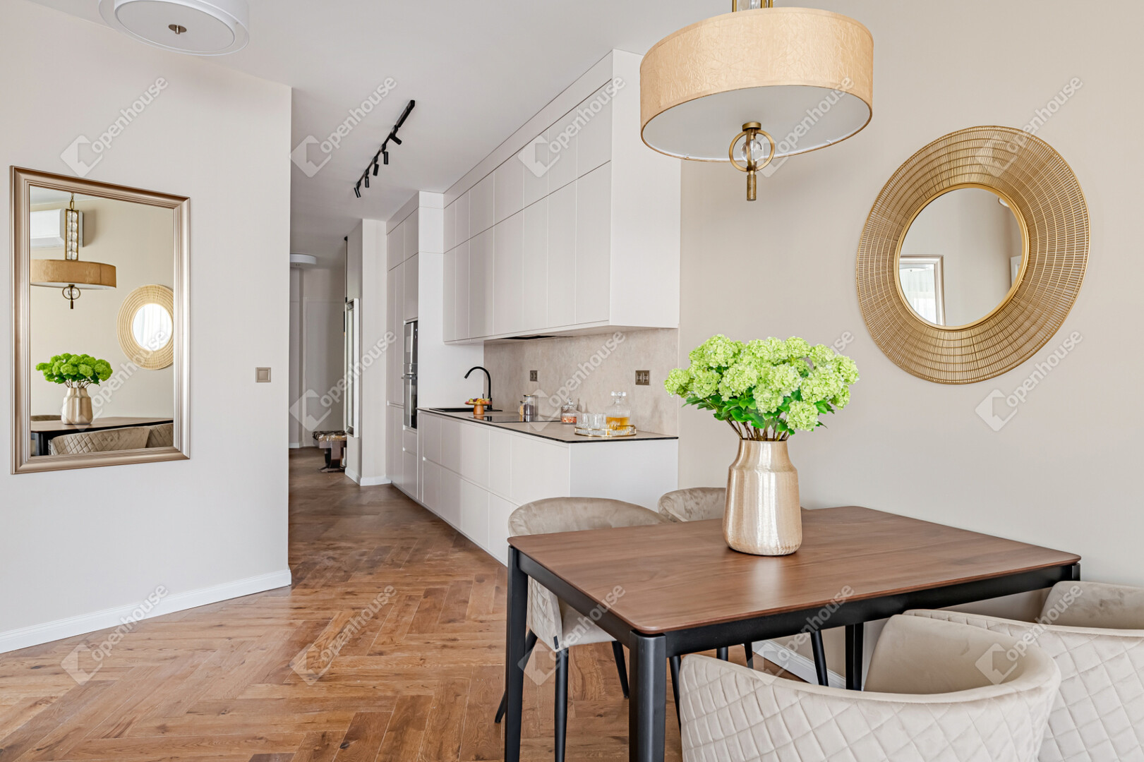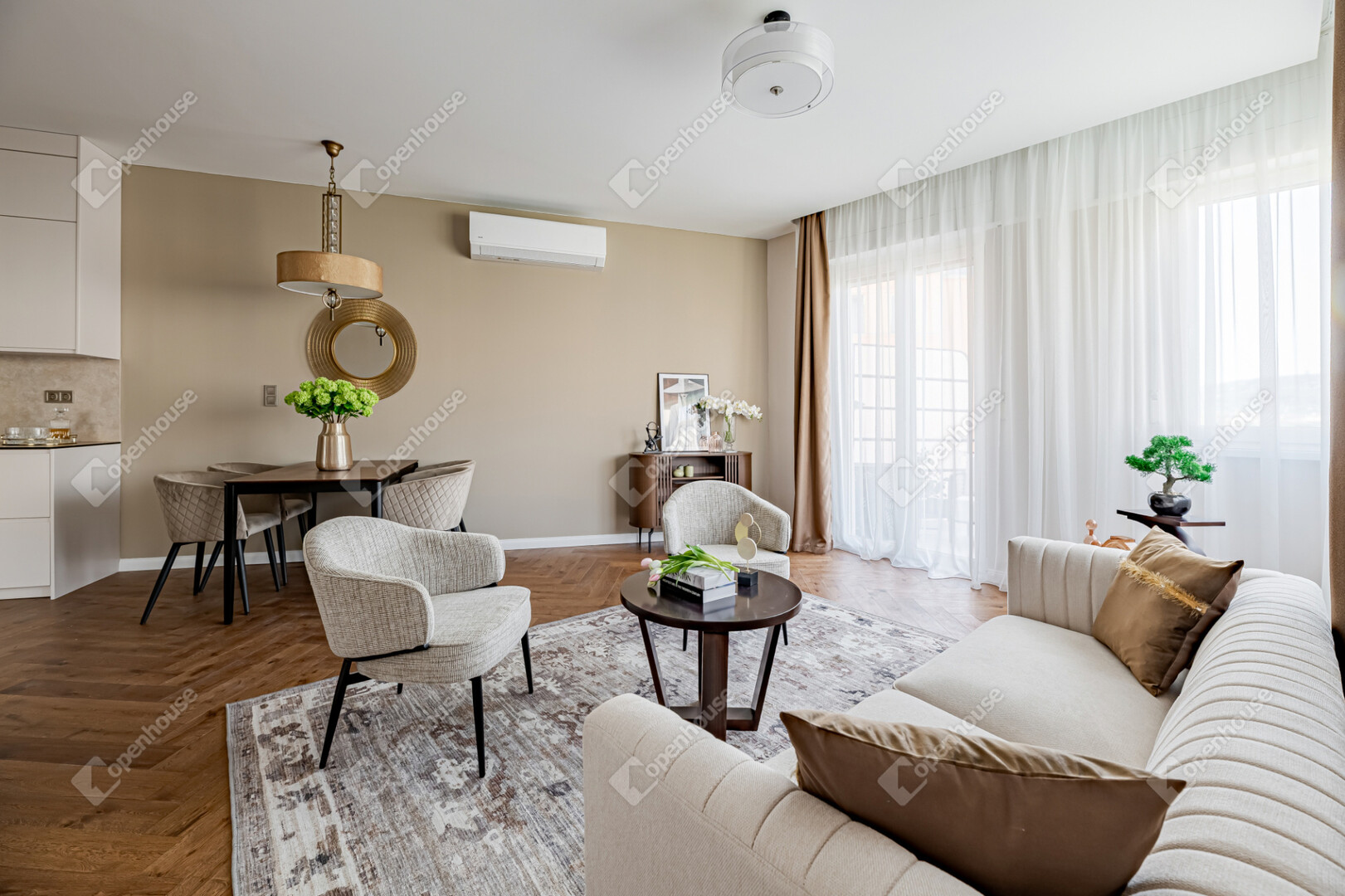 A nappali–étkező–konyha egybenyitott, levegős tér, ahol a világos falak, a meleg tónusú tölgy parketta és a visszafogott bézs árnyalatok nyugodt, kiegyensúlyozott hatást keltenek. A teljesen gépesített, egyedi konyhabútor magasfényű felületei és precíz vonalai elegánsan simulnak a térbe, míg a finoman aranyszínű részletek diszkrét fényt visznek a kompozícióba.