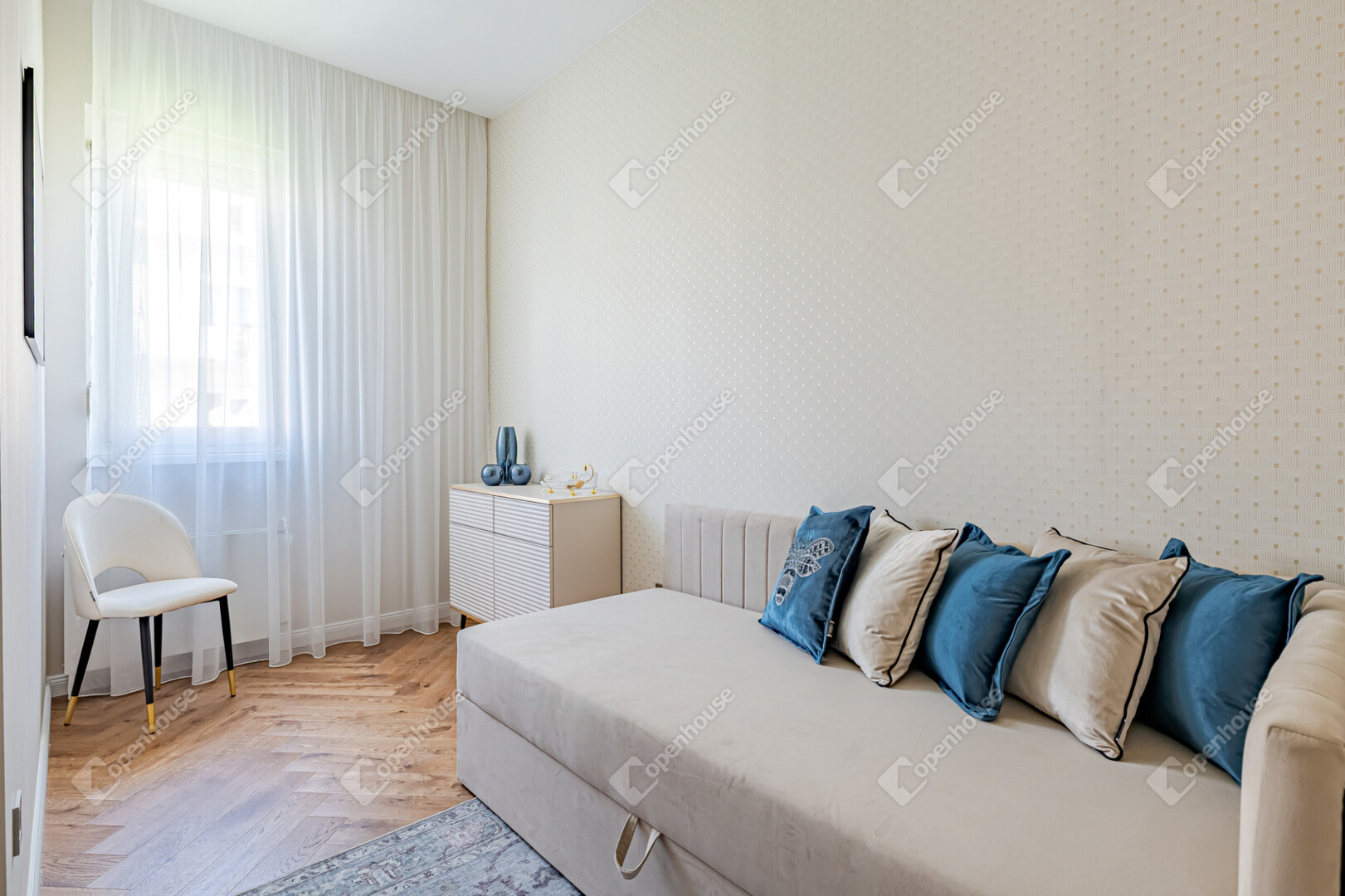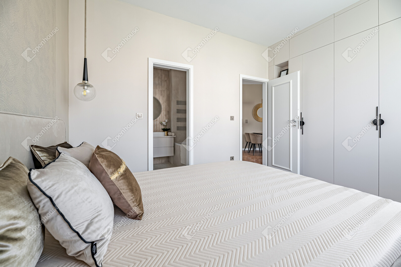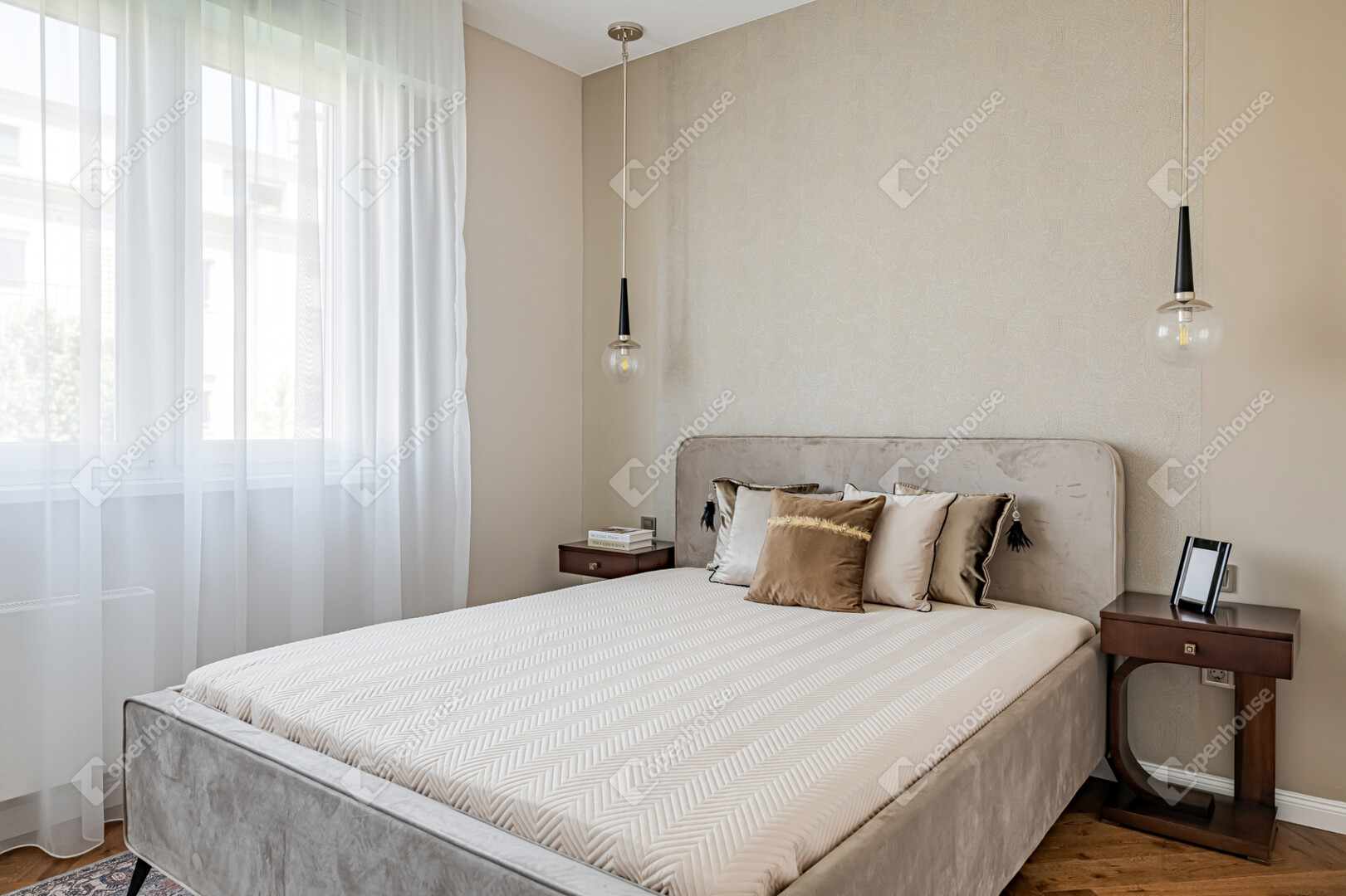 A szülői háló világos és visszafogottan elegáns. A bézs tapéta finom mintázata, a selyemfényű szövetek és a meleg árnyalatú fa bútorok együttese nyugodt, kiegyensúlyozott légkört teremt. A saját, kádas fürdőszoba lágy színei és letisztult formái folytatják ezt a harmóniát – itt minden részlet a pihenést szolgálja.
