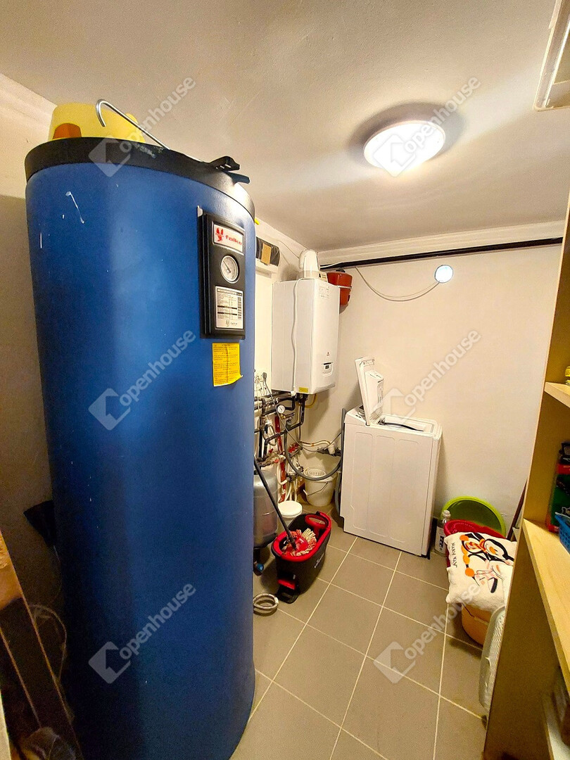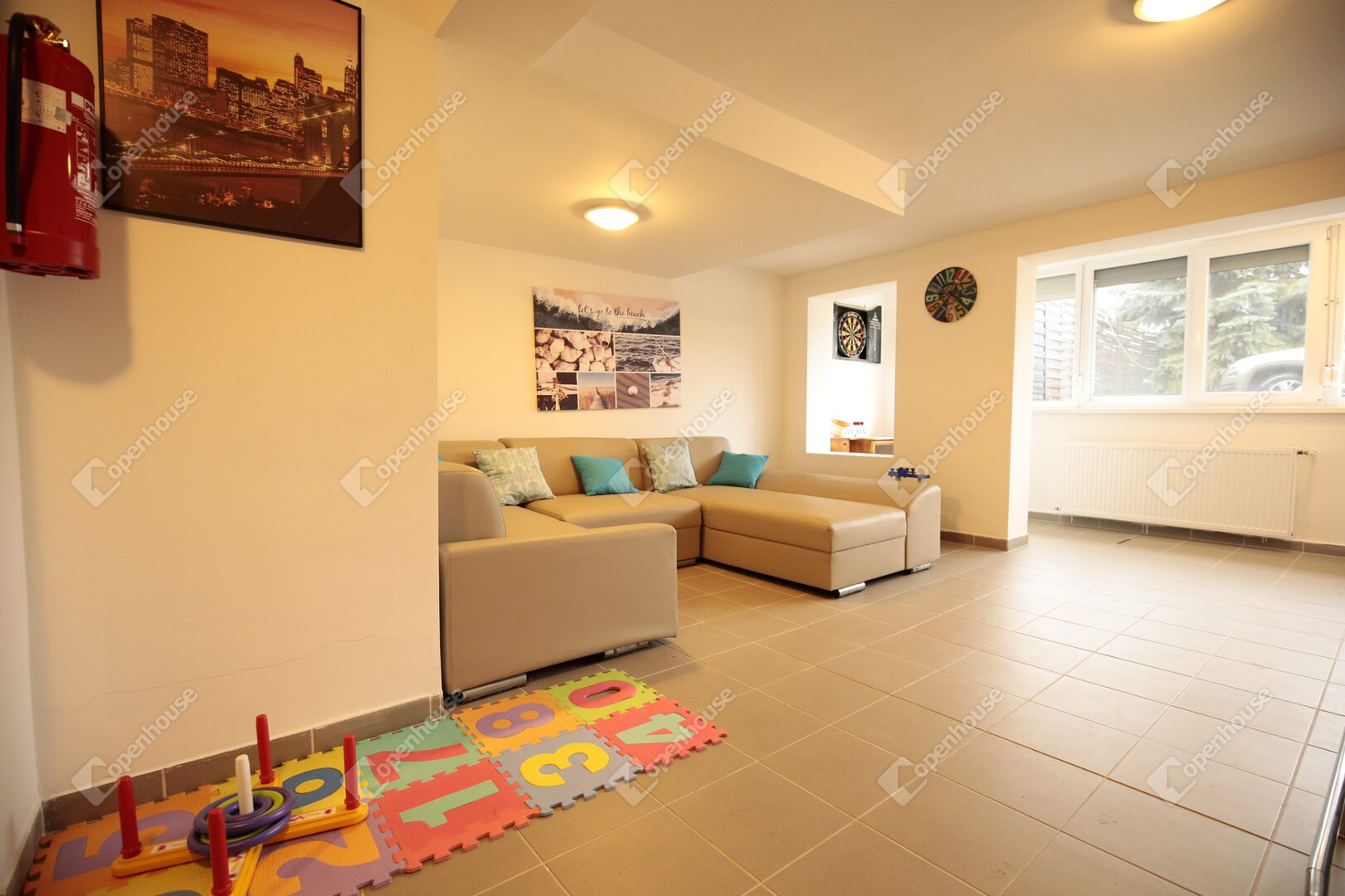 A szuterénben közösségi tér rengeteg játékkal, bőr ülőgarnitúrával, ott található WC, egy kazánház, ami egyben mosókonyhaként is működik.