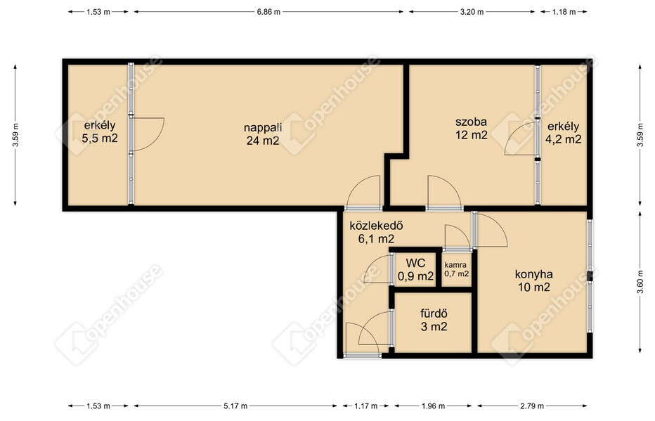 - Alapterülete nettó 59 m2-es, melyben 2 szoba, konyha, kamra, közlekedő, fürdő, WC helyiségek lettek kialakítva.