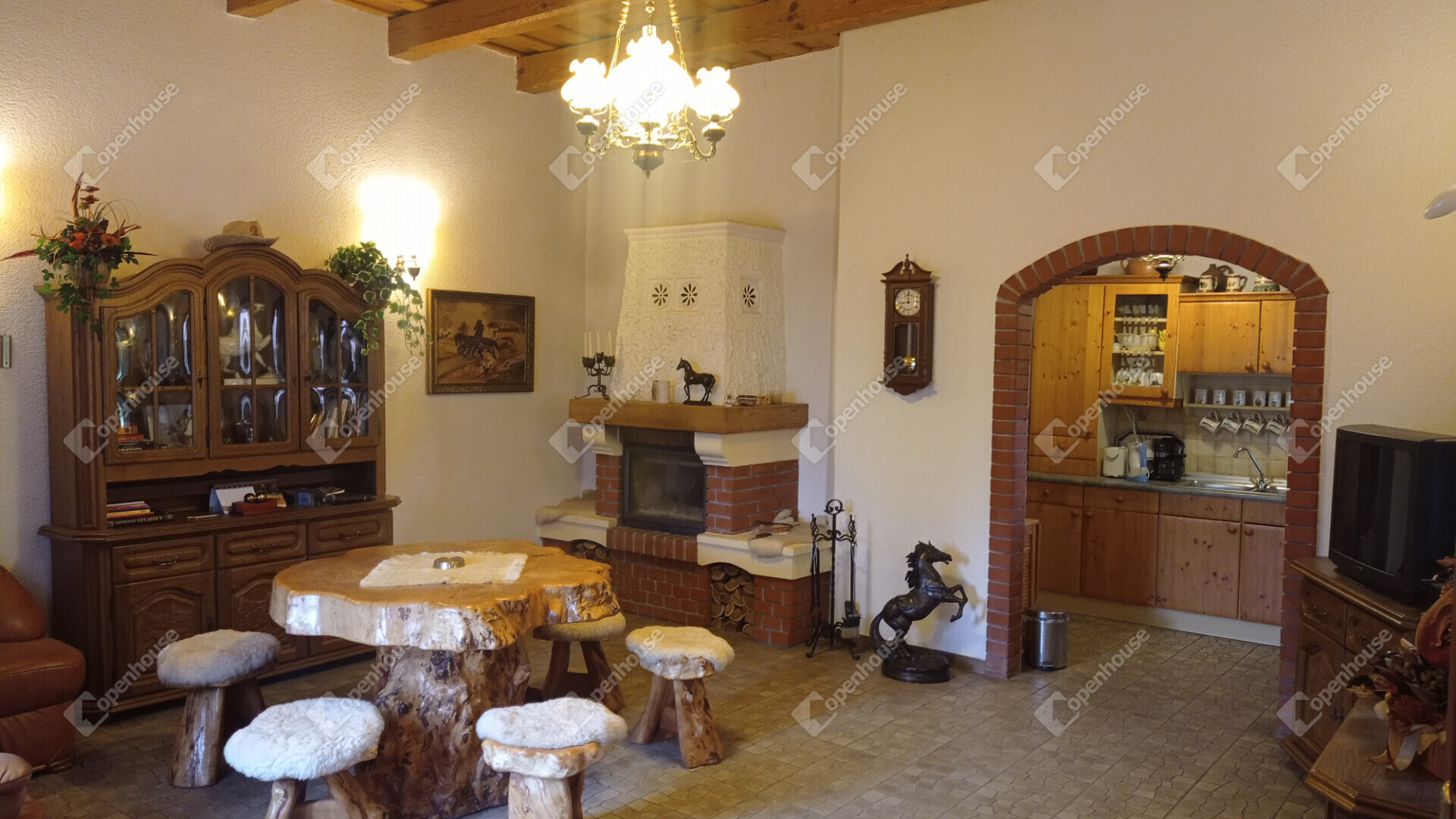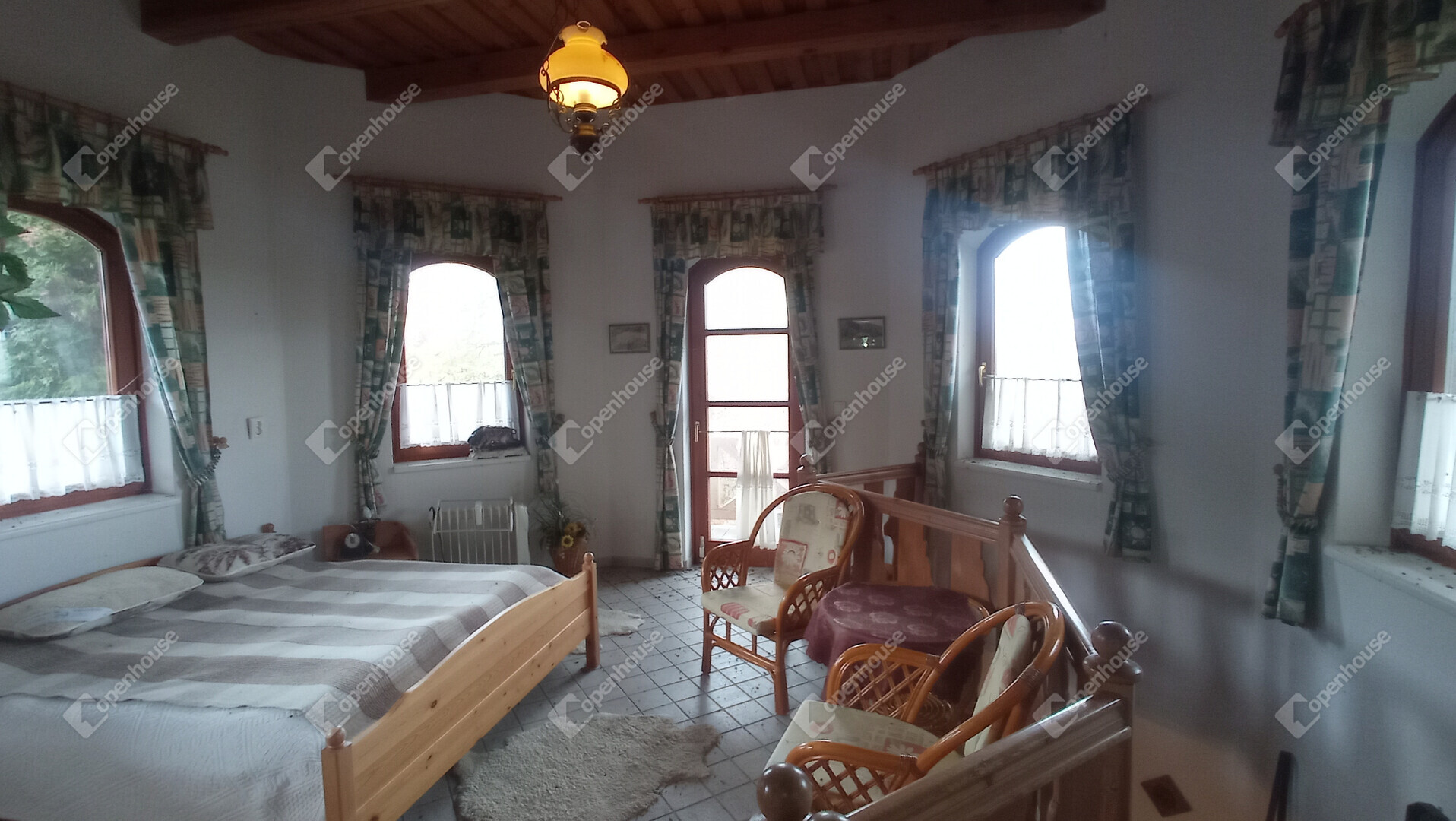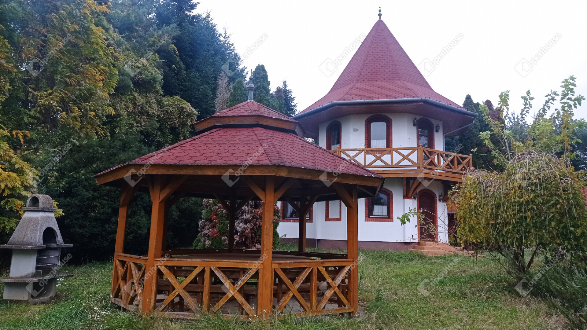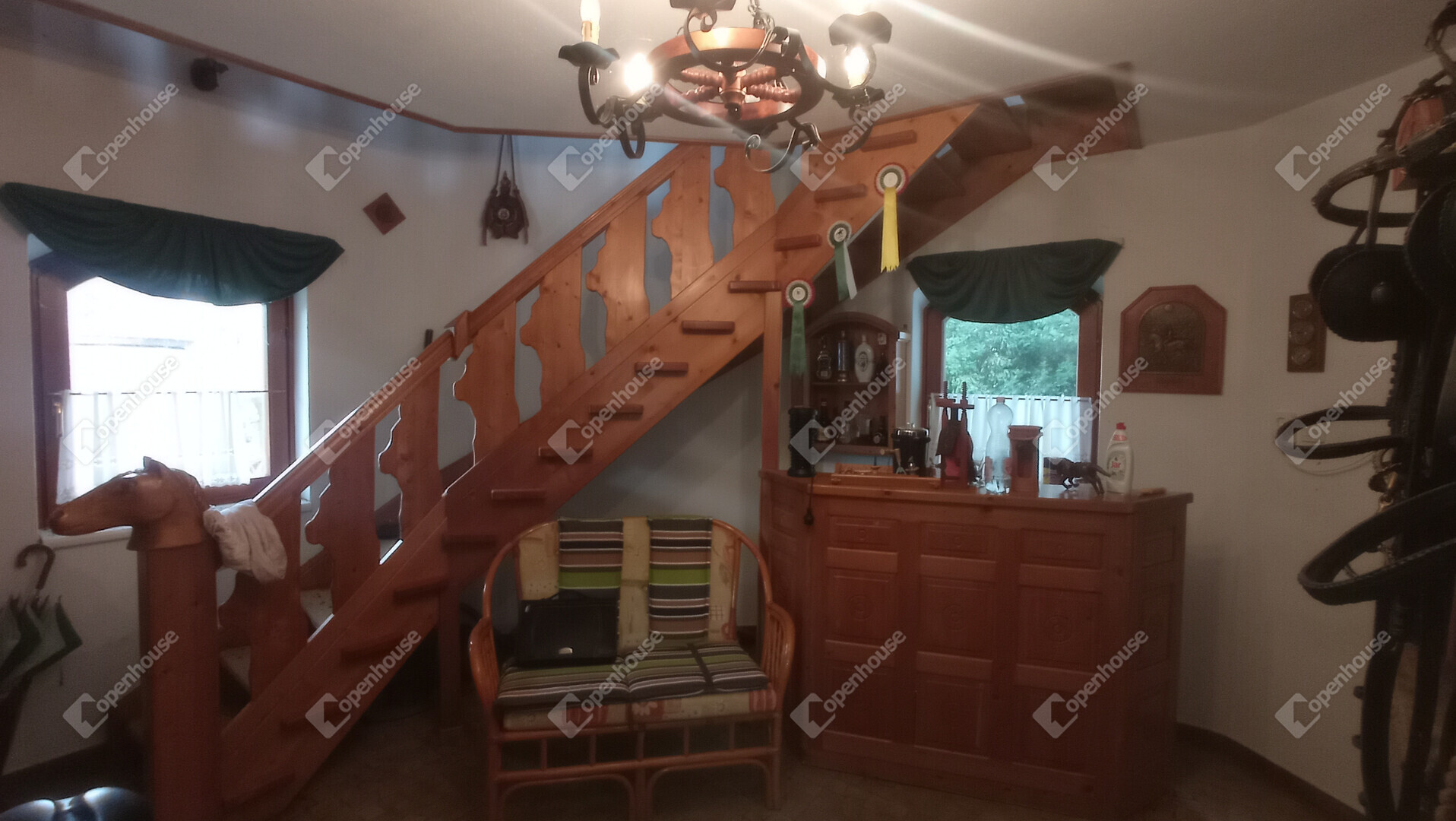 A főépület egy kétszintes, ízlésesen berendezett azonnal költözhető, teljesen felszerelt lakóház bárpultos fogadószobával, nappalival, konyhával, fürdővel emeleti részen fantasztikus hangulatú szobával amihez félkörívben fából épített erkélyéről csodásan elénk tárul az egész birtok.