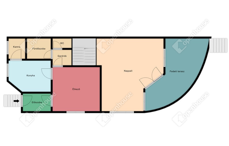 - A földszinten helyet kapott a nappali, az étkező, a konyha, egy zuhanyzós fürdőszoba és egy külön WC.