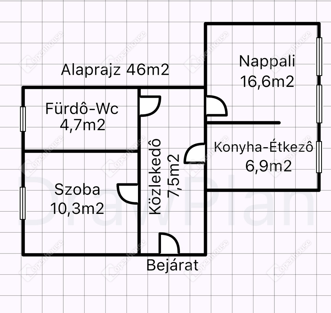 -Helyiségek 46m2 alapterületen: szoba, konyha-étkező, nappali, közlekedő, fürdő-wc.