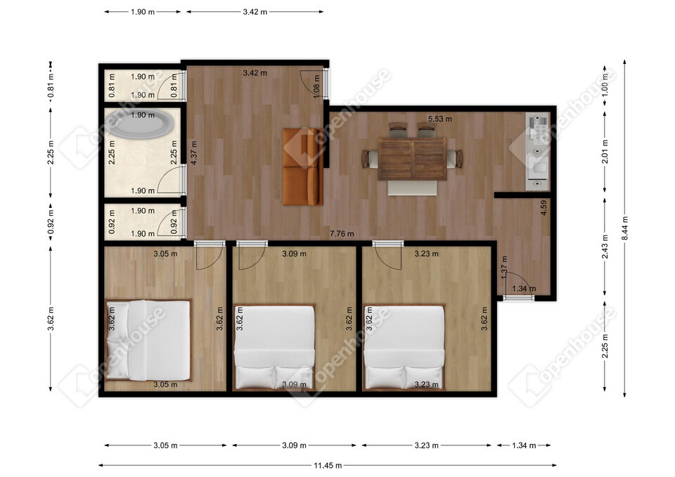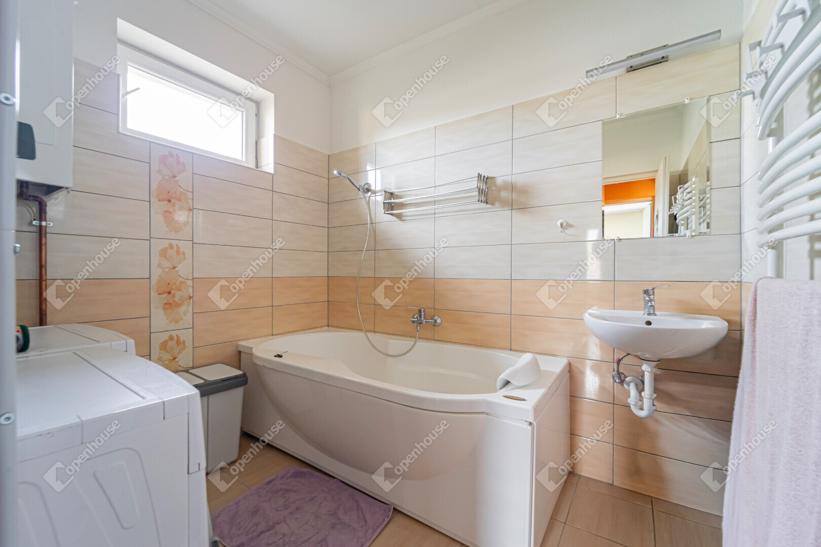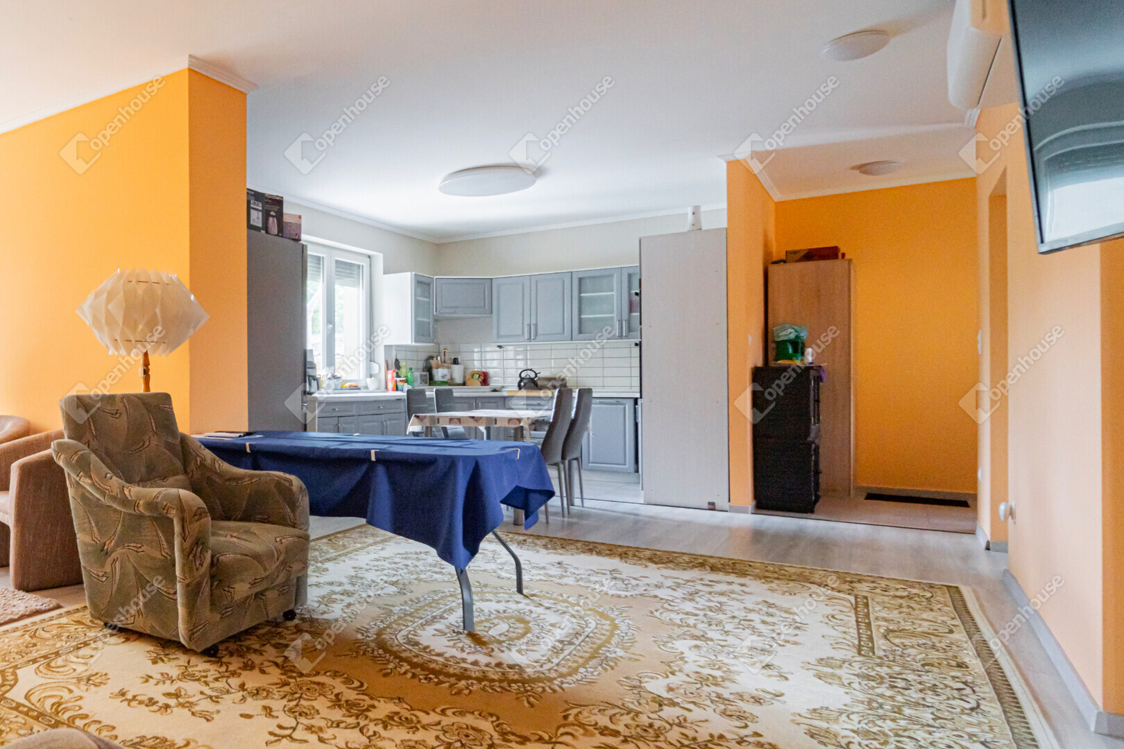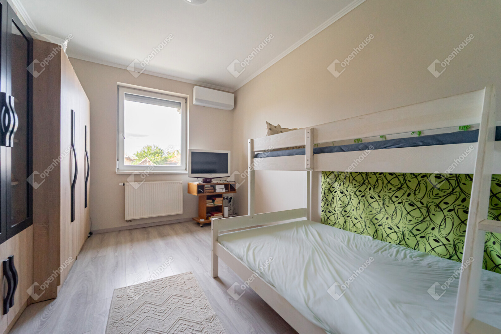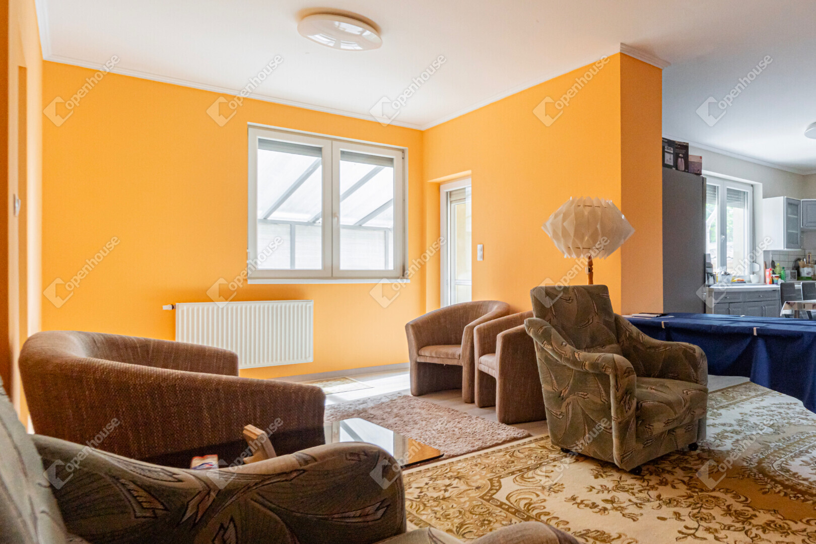 A ház belső tere minden igényt kielégít: a tágas amerikai konyhás nappali a központi élettér, ahol a család és a barátok kényelmesen együtt lehetnek. A nappali mellett három külön nyíló hálószoba biztosítja a privát szférát – ideális nagyobb családnak, otthoni irodának vagy vendégszobának is.