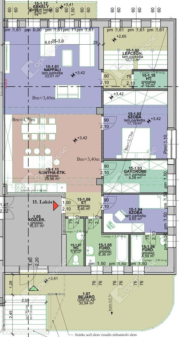 | Amerikai konyha | 29.96 m2 | Járólap |