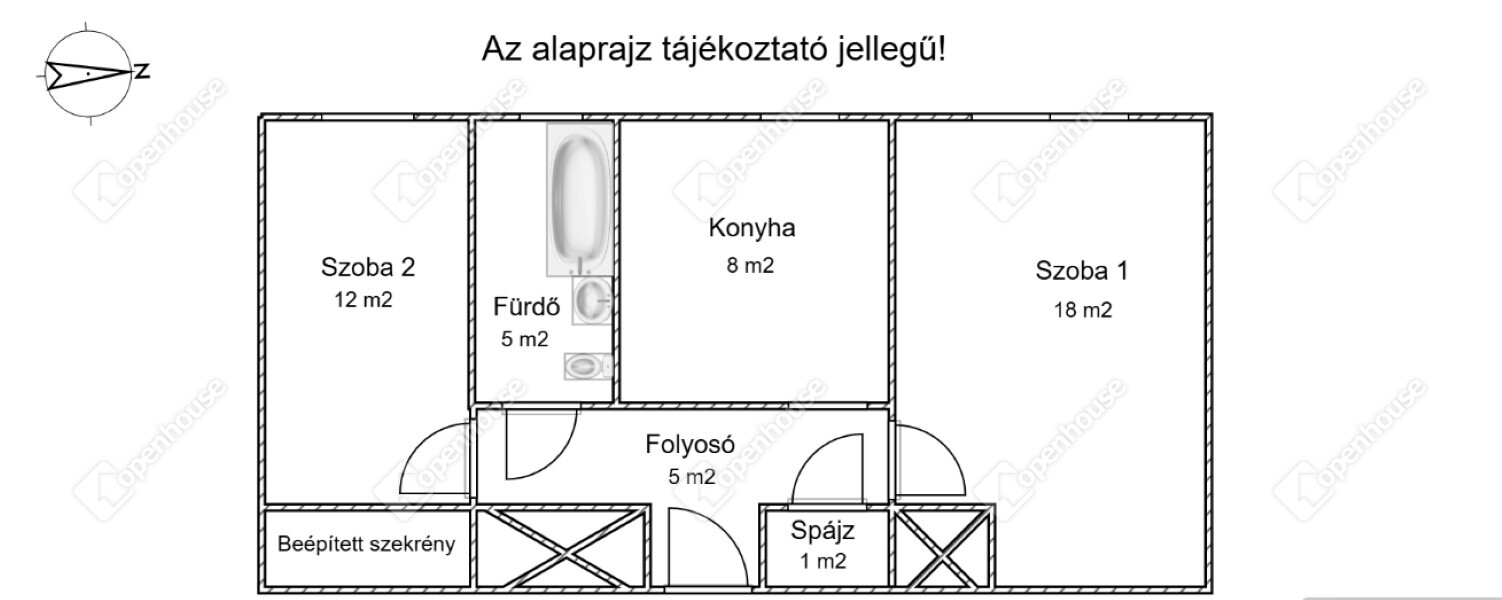 49 m², két külön nyíló szoba, konyha, fürdő–WC és spájz