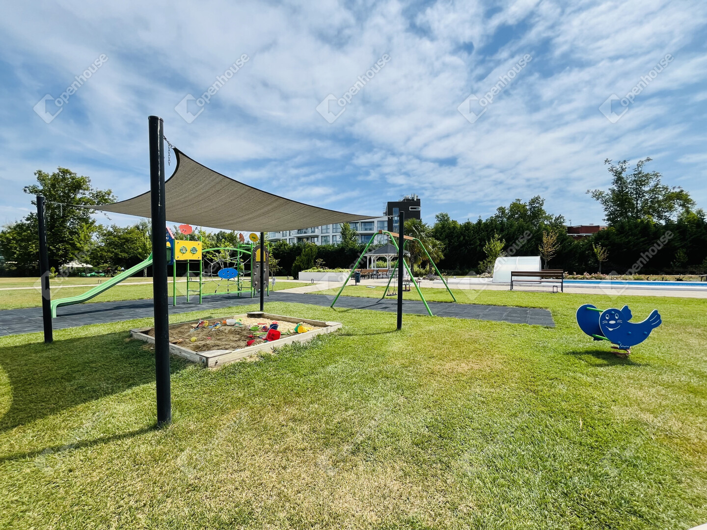 - Medence, játszótér, parkosított pihenőzónák