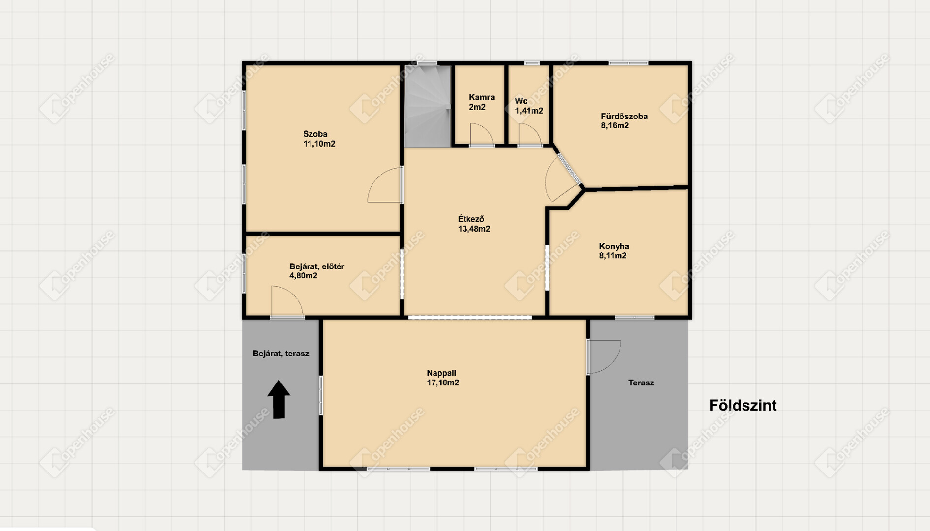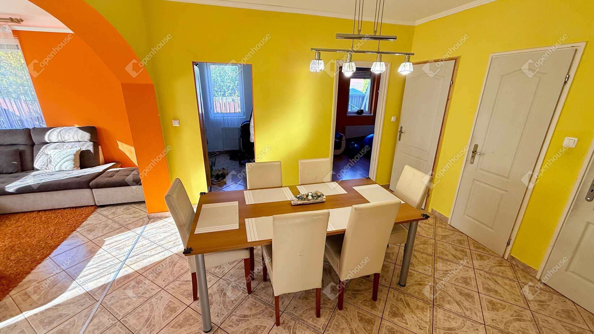 Földszint: előtér, étkező, konyha, tágas nappali, fürdő, külön WC, és egy szoba.