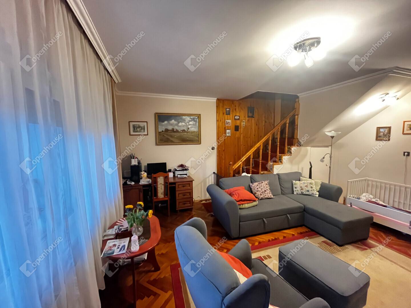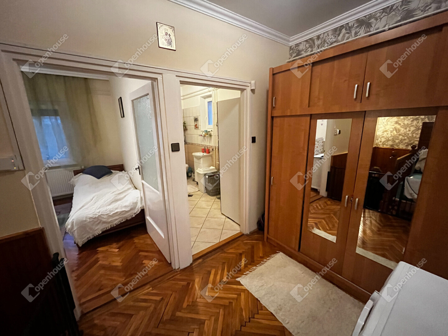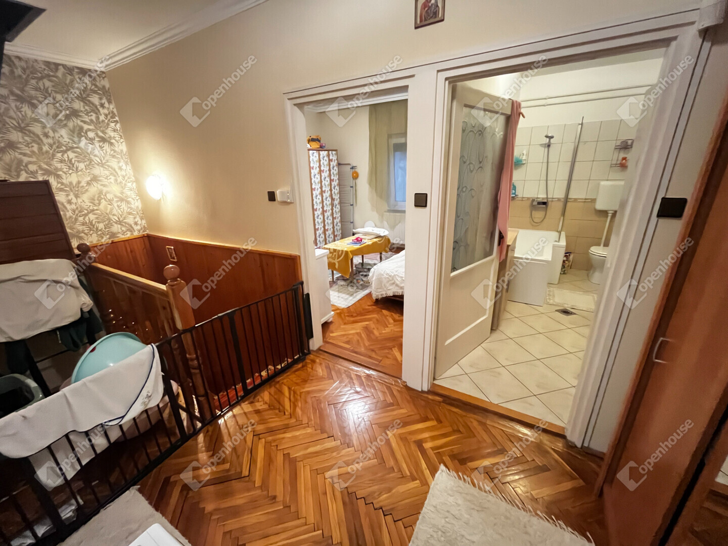 - A szobákban és a nappaliban, faparketta, konyhában előtérben, kamrában és a fürdőszobában, wc-ben, járólap van.