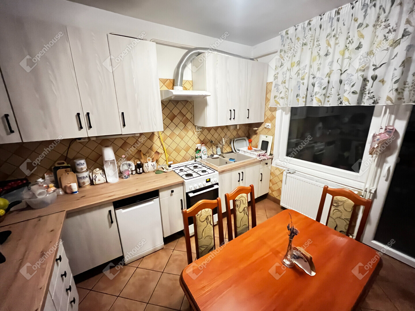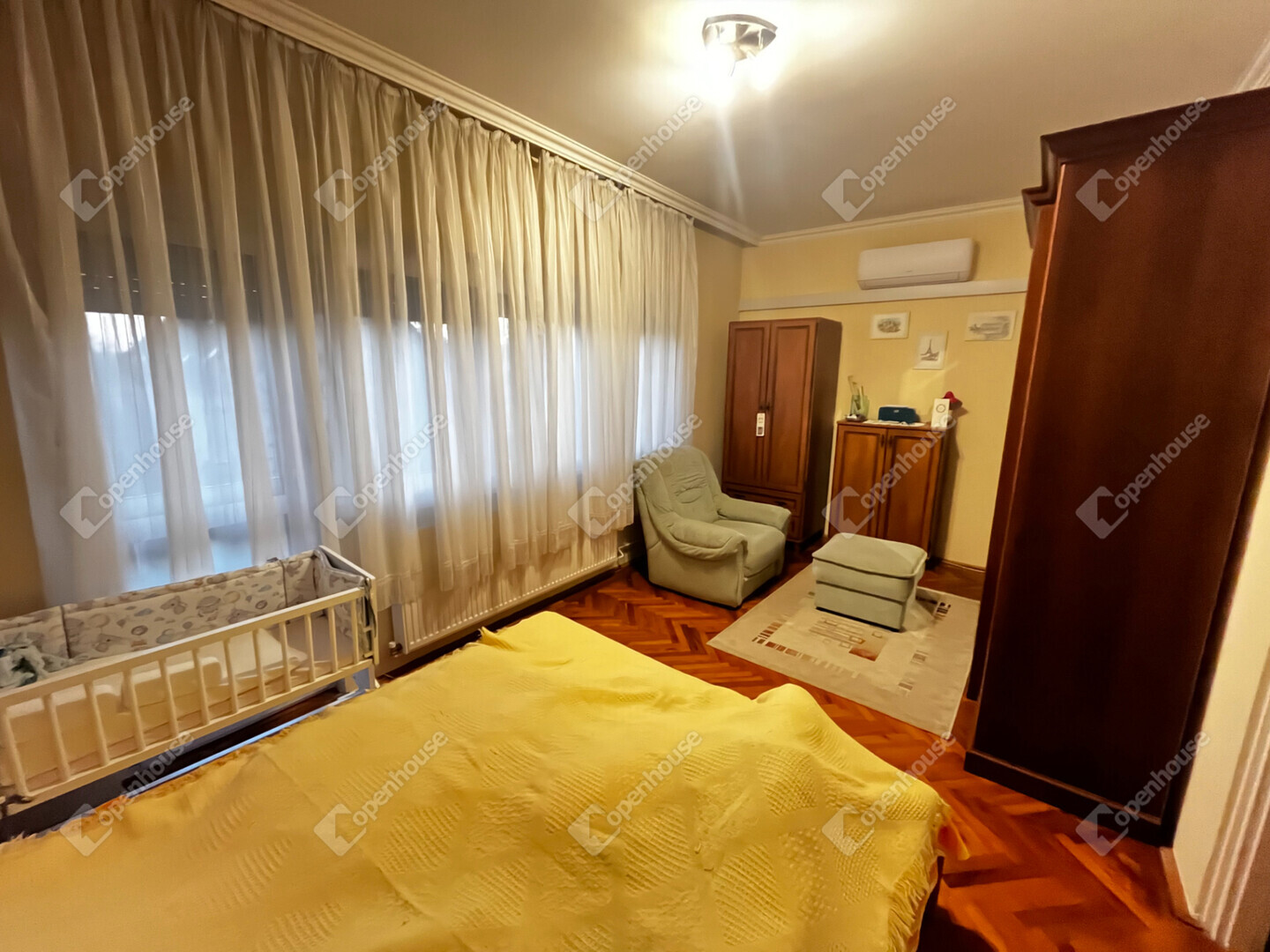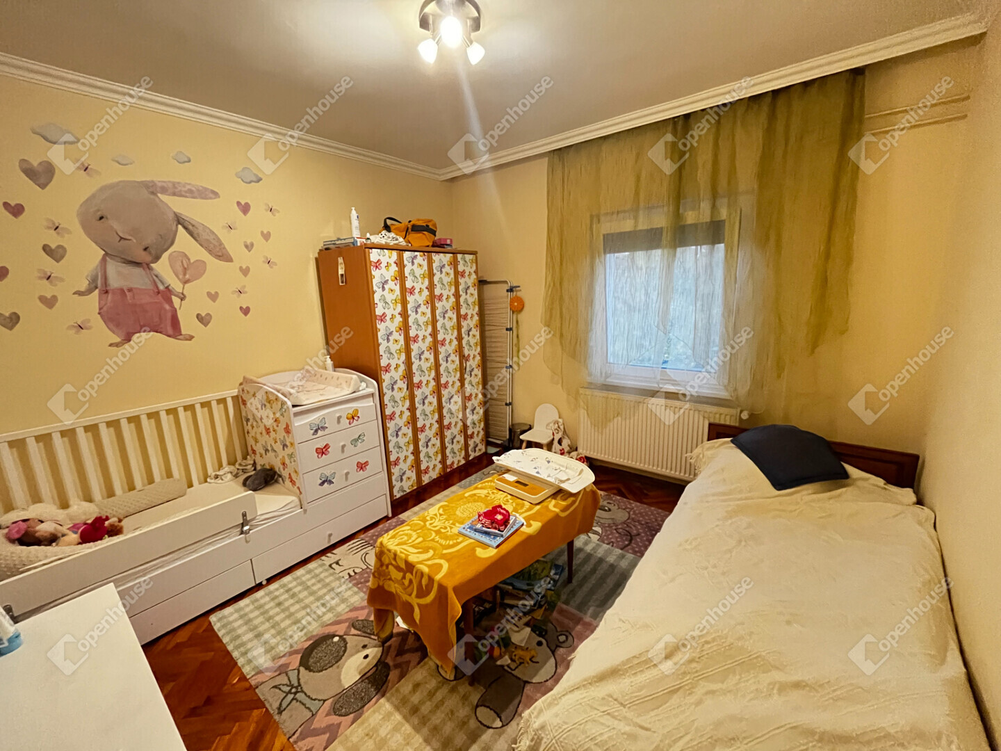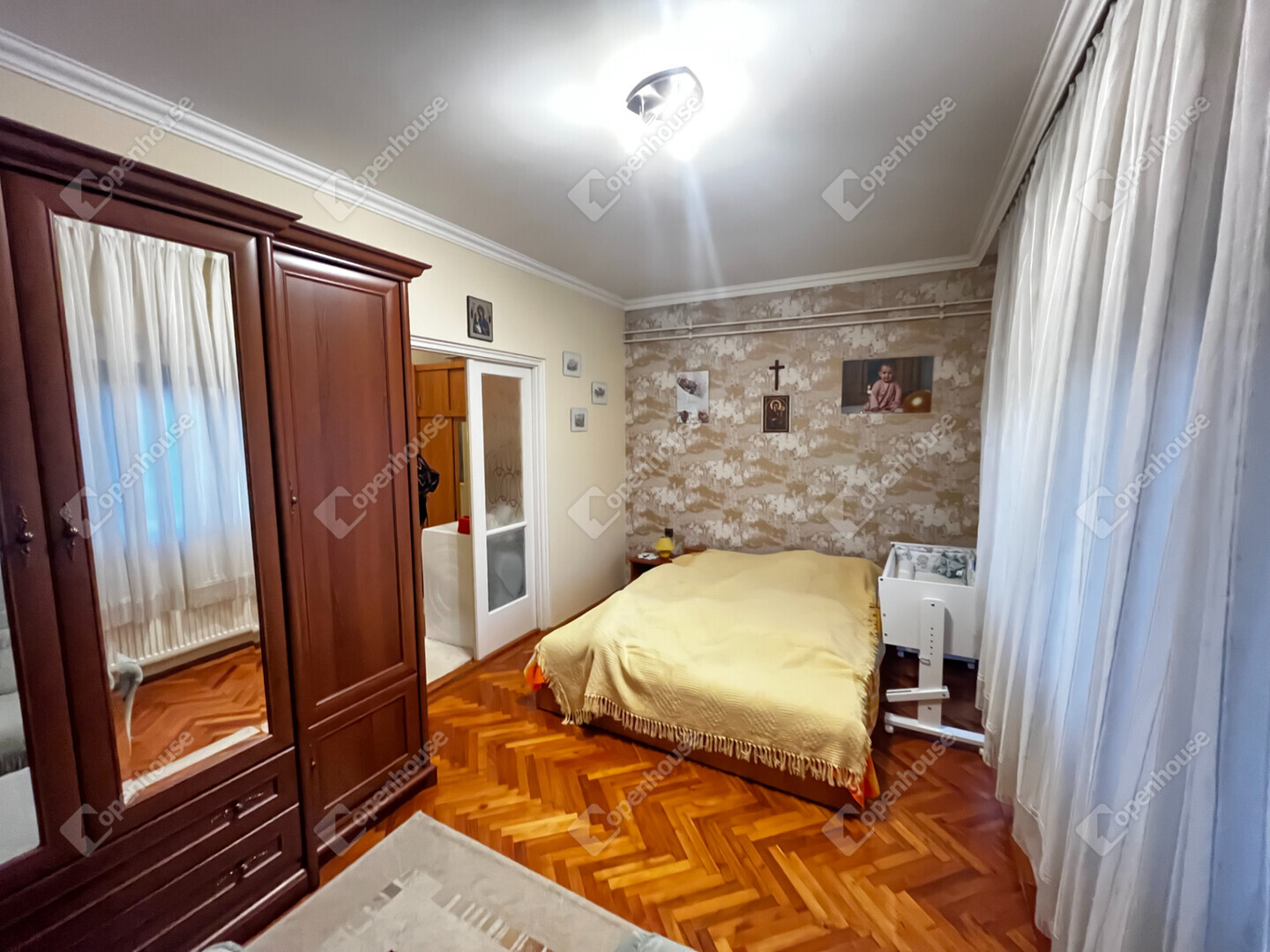 - A szobákban és a nappaliban, faparketta, konyhában előtérben, kamrában és a fürdőszobában, wc-ben, járólap van.