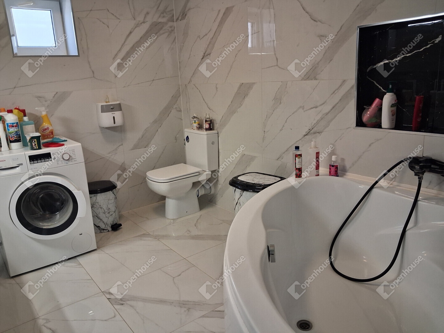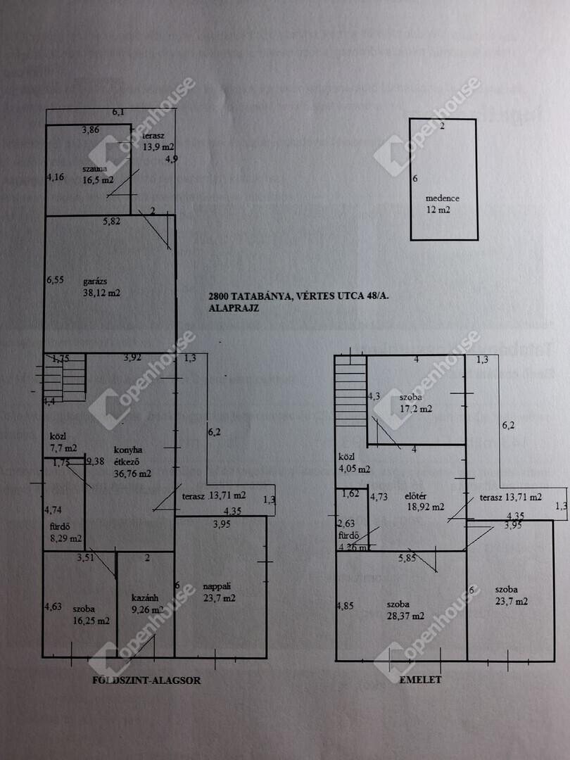 - a földszinten található: - egy előszoba, mely egy légtérben található a tágas, igényes amerikai konyhával illetve tágas nappalival. Innen keresztül közelíthetjük meg a külön nyíló 2 hálót, valamint a tágas fürdőszobát, ahol a egy kényelmes kád, egy mosdó, wc illetve egy mosókonyha található . Innen egy közel 20 nm-es fedett teraszra jutunk és a szépen gondozott,automata locsoló rendszerrel ellátott füvesített kertünkbe, ahol egy 12 nm-es téliesített medence található