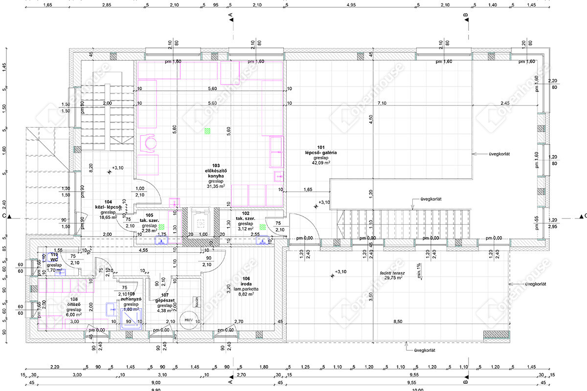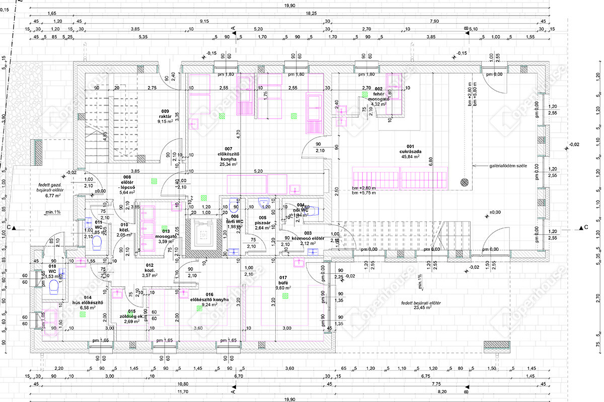 A földszinten és emeleten külön előészítő konyhák, raktárak, öltözők, iroda és mellékhelyiségek kaptak helyet.