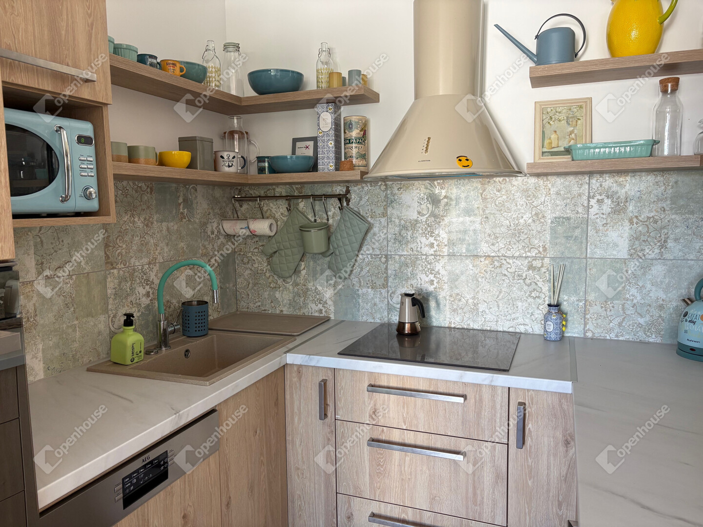 Modern, gépesített konyha,stílusos ,igényes burkolatok, bútorok , napfényes terek jellemzik a nyugati fekvés lakást.