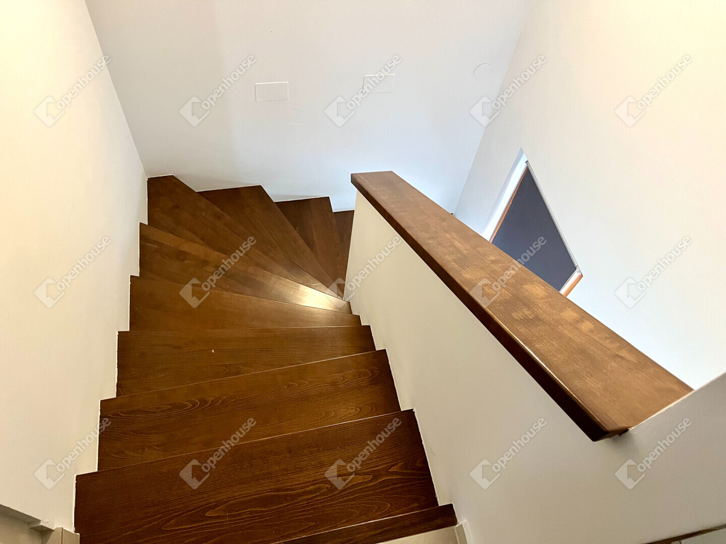 A földszinten egy tágas, napfényben fürdő nappali teremt otthonos, meleg hangulatot.