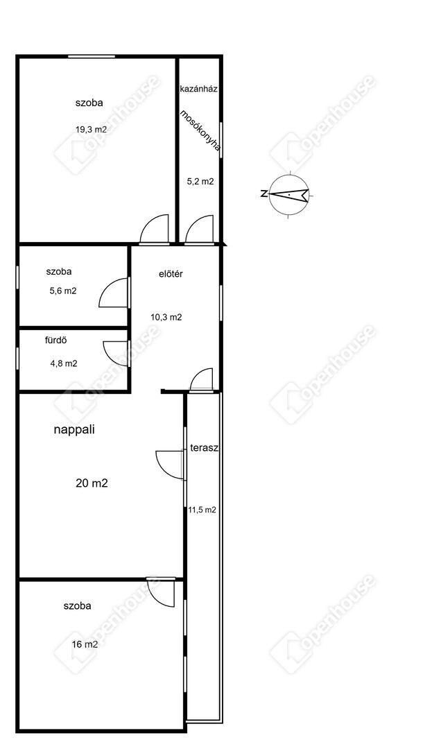 amerikai konyhás nappali, három hálószoba, előtér, fürdő–WC és kazánház–mosókonyha, ahol akár egy második WC is kialakítható.
