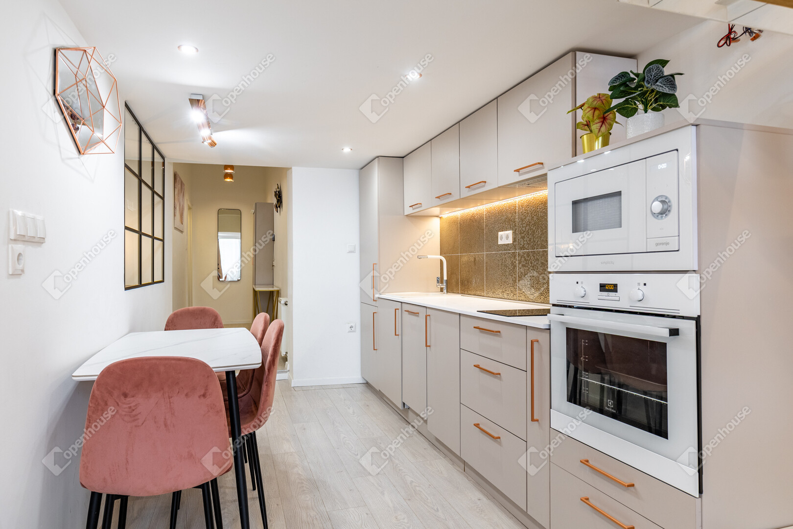 – konyha-étkező, amelyben a fények és a pasztell tónusok finoman vezetnek végig