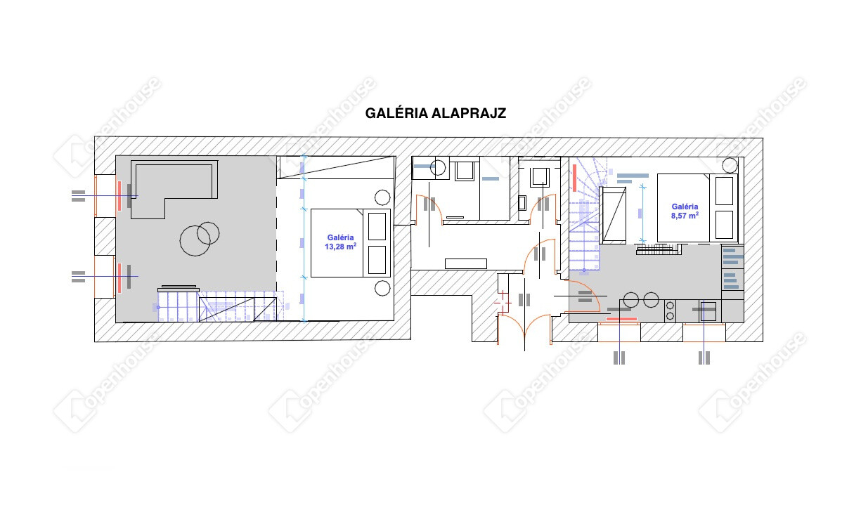 69 m², két lakássá alakítva (44 és 25 m²), mindkettő galériázott, jól elkülönülő életterek