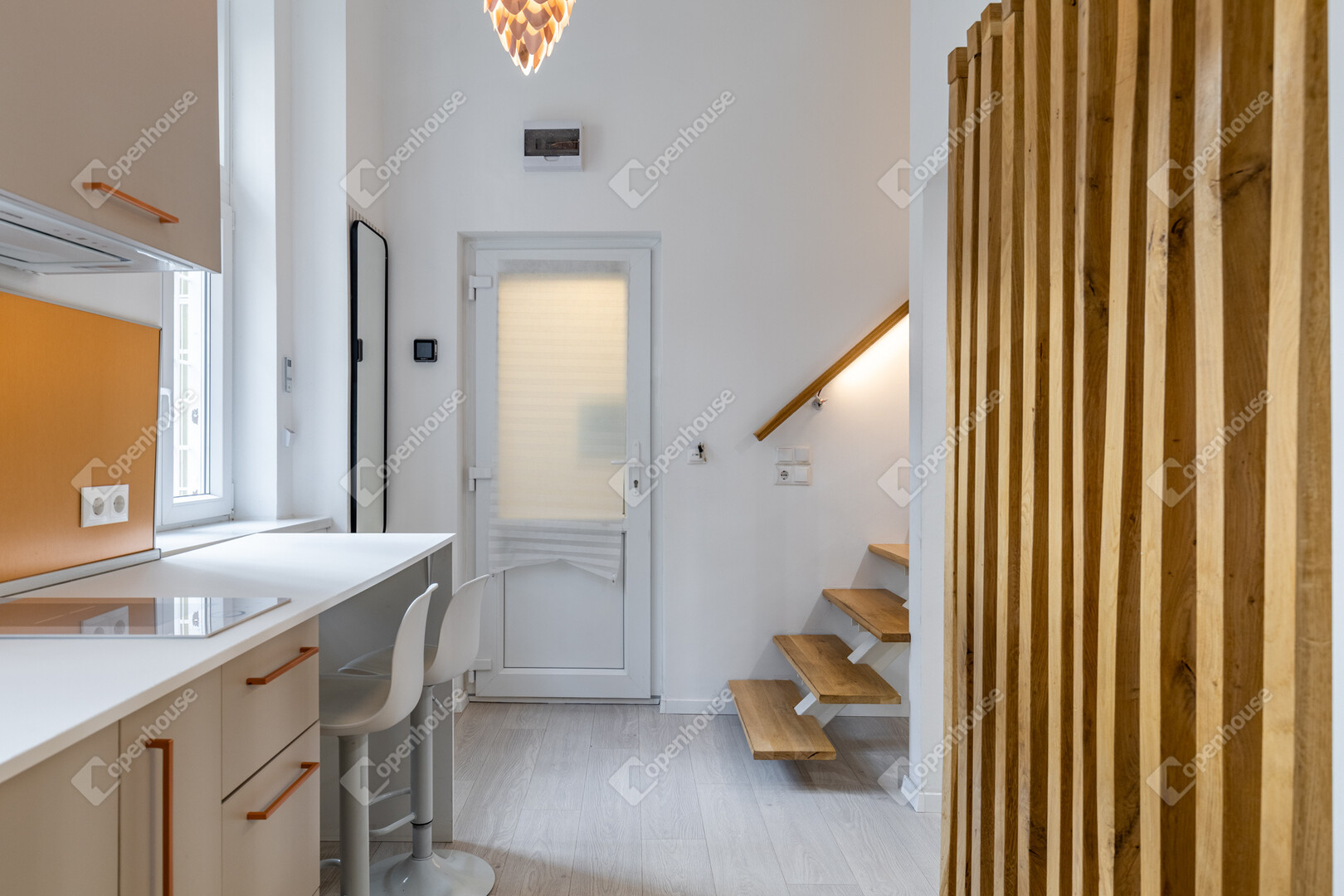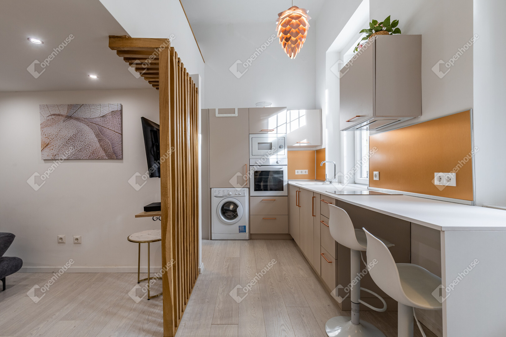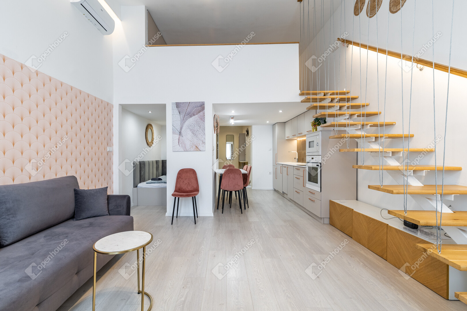 A nappali légies magassága, a két hálórész ritmusa, a minőségi anyaghasználat és a teljeskörű felújítás egy letisztult, mégis meleg atmoszférát hoz létre – jelenleg bejáratott prémium rövid távú bérbeadásként üzemelve.