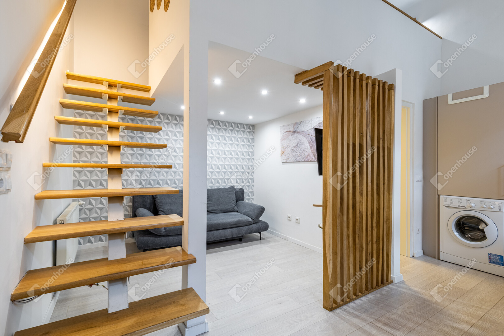 A burkolatok textúrái, a légies lépcső, a rejtett világítások és a természetes anyagok meleg harmóniát teremtenek.