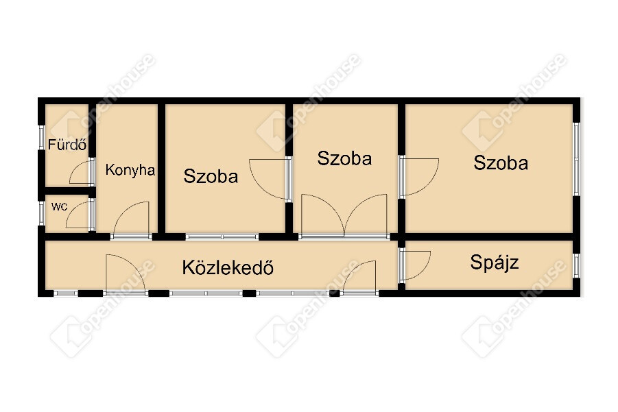 - 3 szoba, közlekedő, konyha, fürdő wc, spájz elosztású