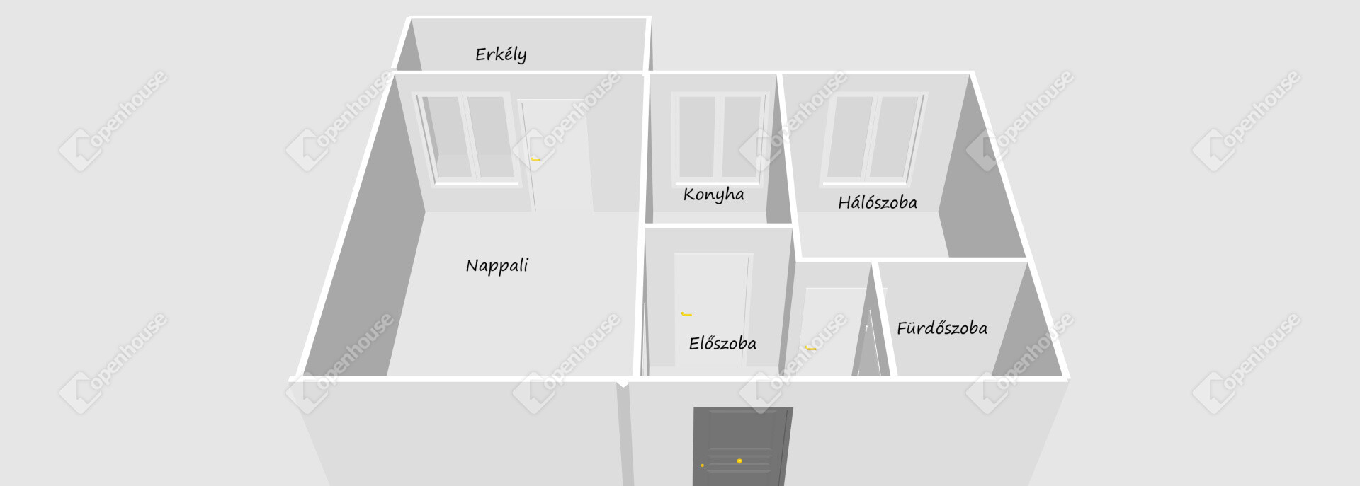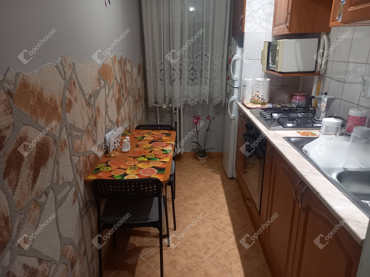 Helyiségek: előszoba, konyha, fürdőszoba (kád) + WC, 2 szoba