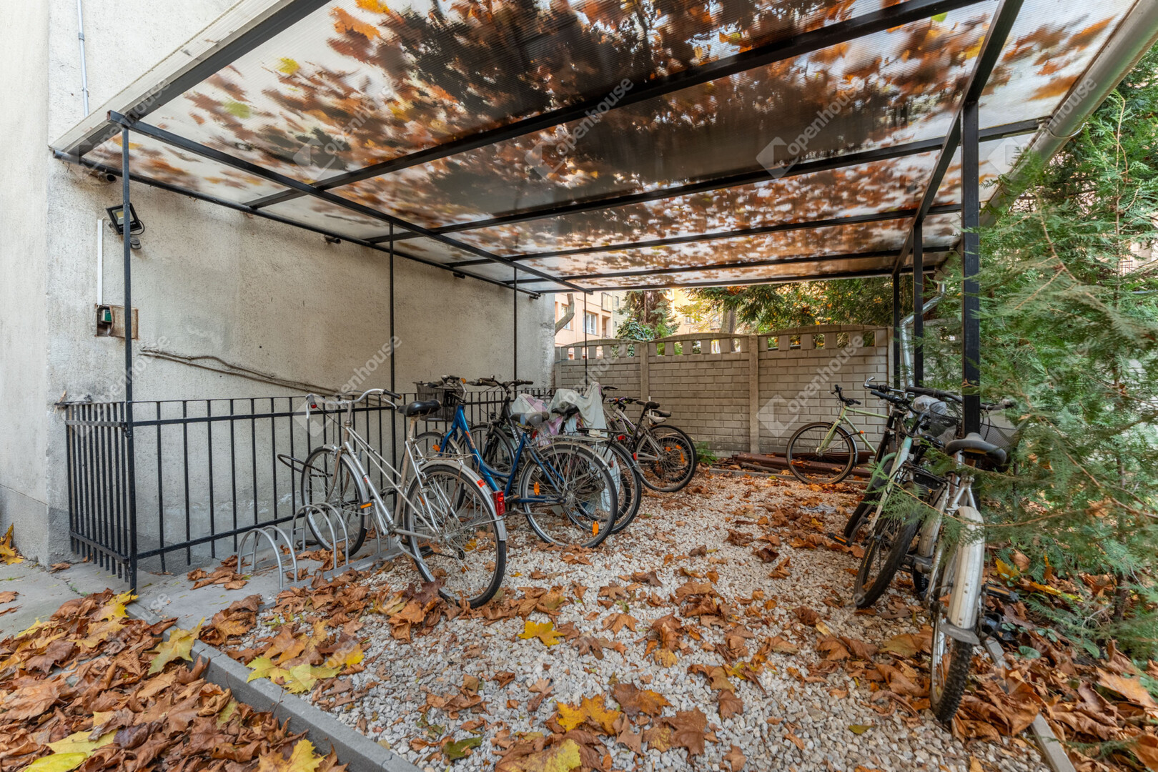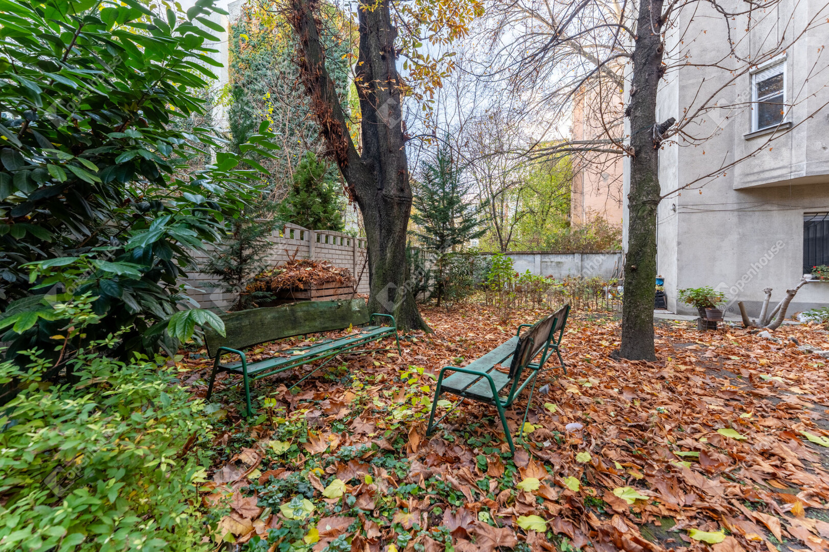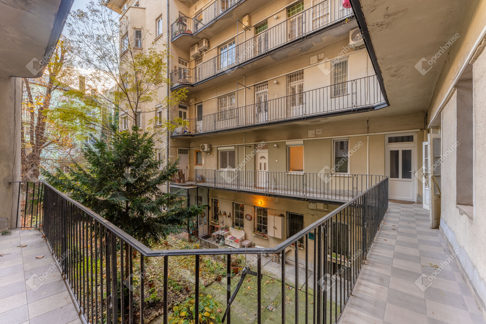 A belső udvar külön érték: zöld, csendes kert, padokkal és fedett biciklitárolóval — ritka előny a környéken.