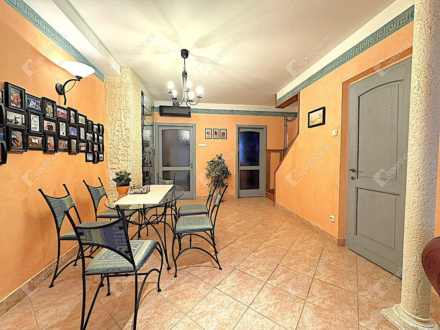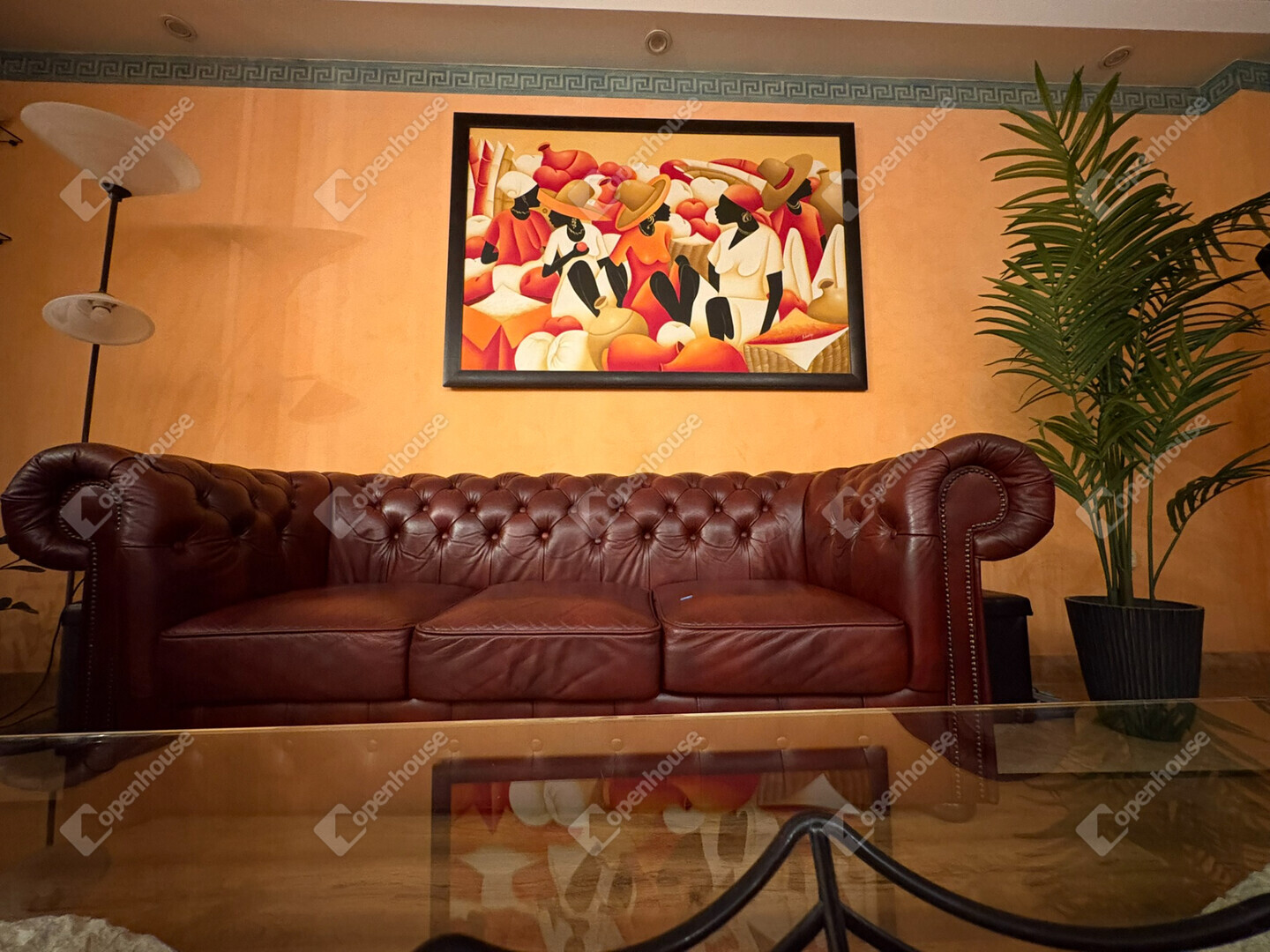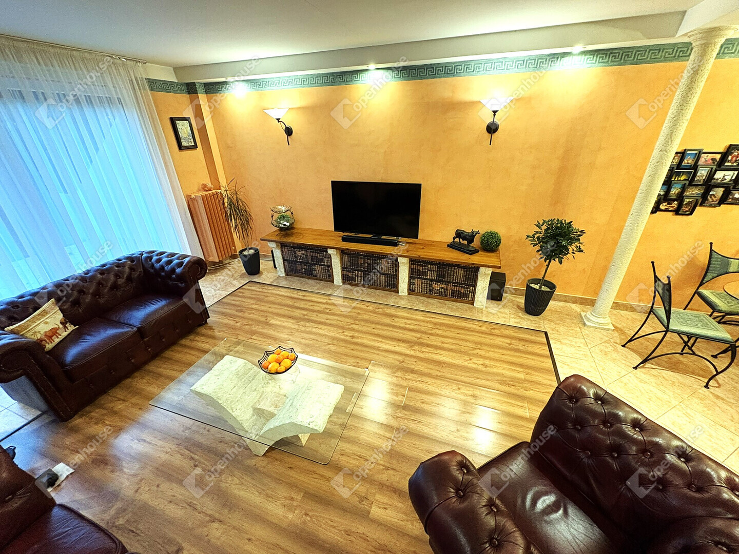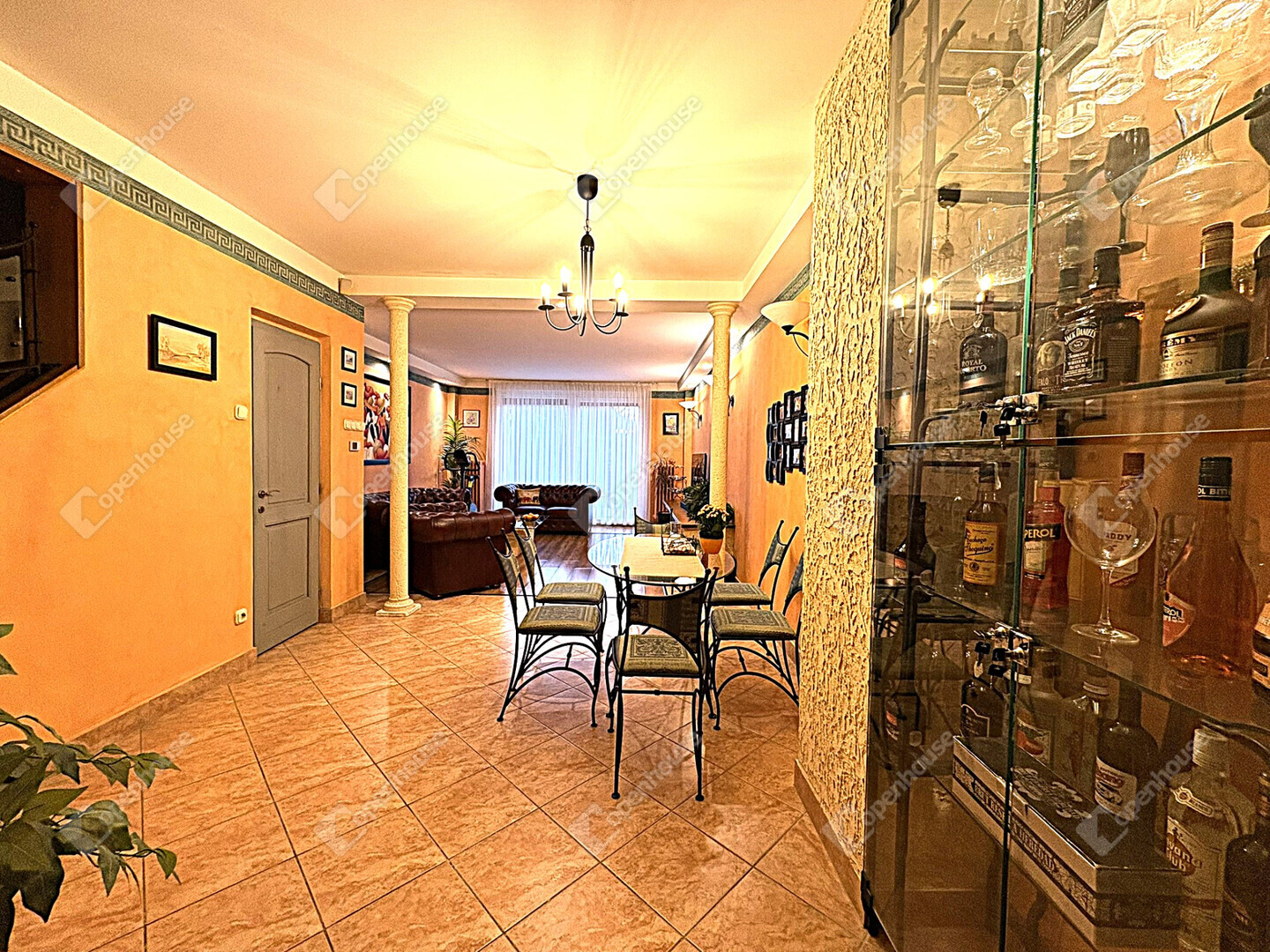 - A nappali tágas, beépített bútorokkal és Chesterfield bőr ülőgarnitúrával berendezett, az étkező kovácsoltvas bútorokkal felszerelt.