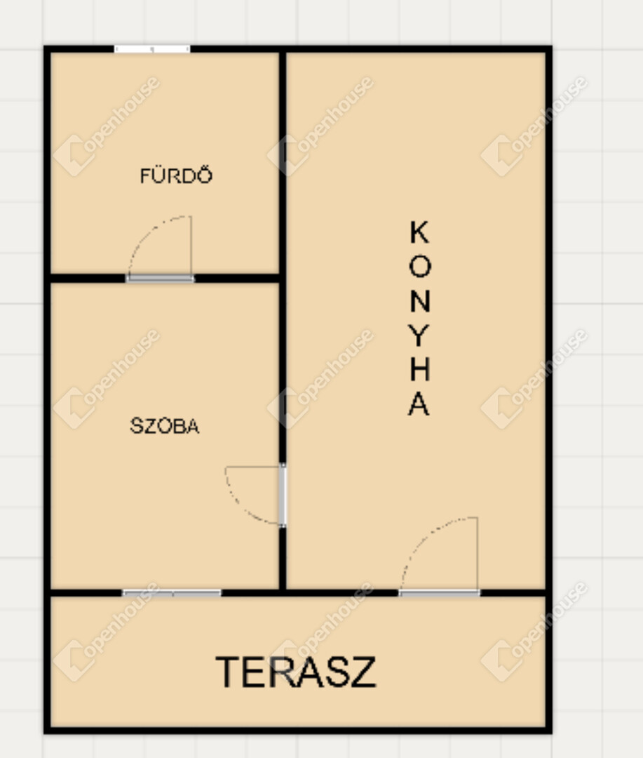 Elrendezés: konyha, szoba, fürdőszoba, fedett terasz.