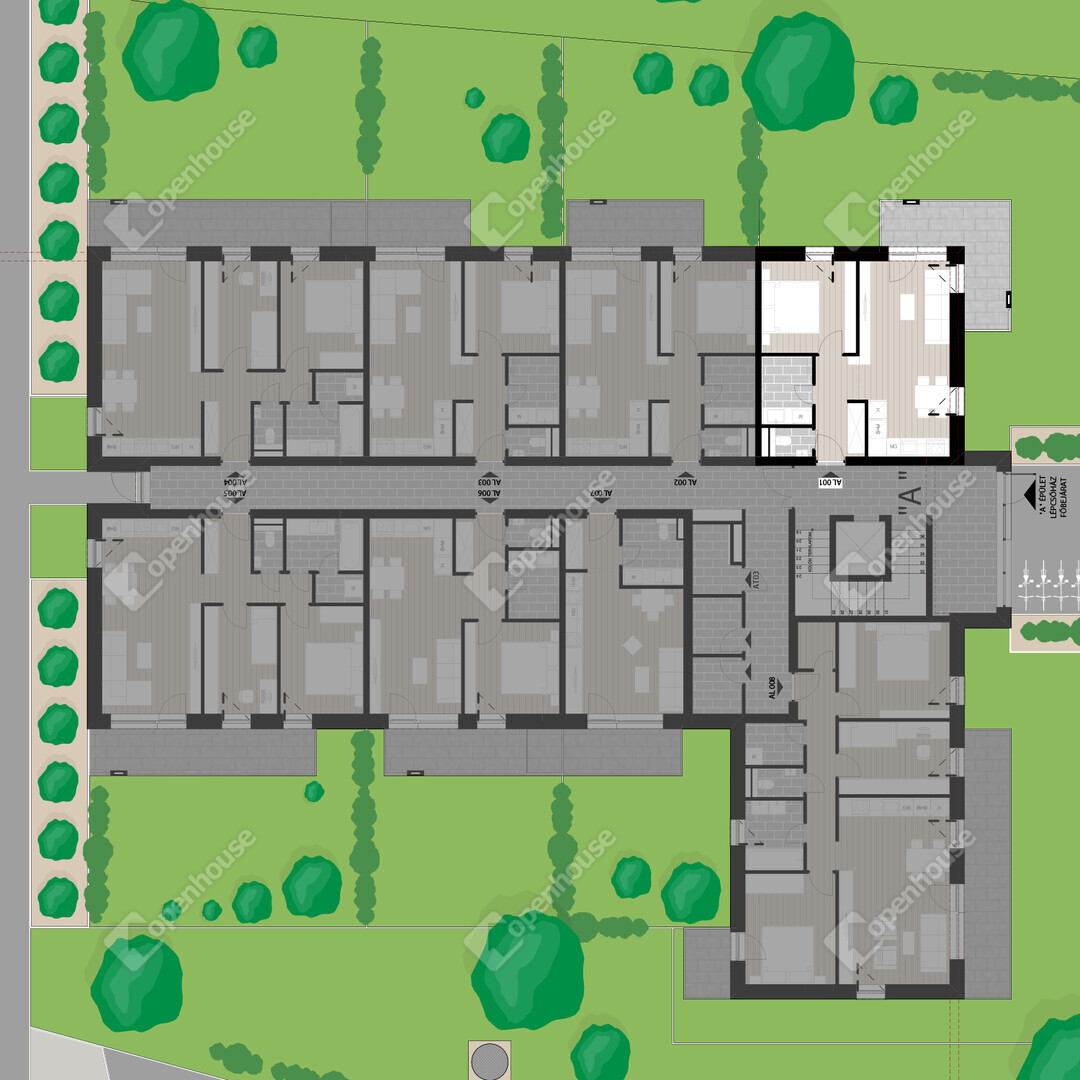 AL001 lakás: földszinti 42,49 m2 alapterületű, 1 szoba nappali elrendezésű, 11,65 m2 terasszal és 137,58 m2-es kertkapcsolattal.