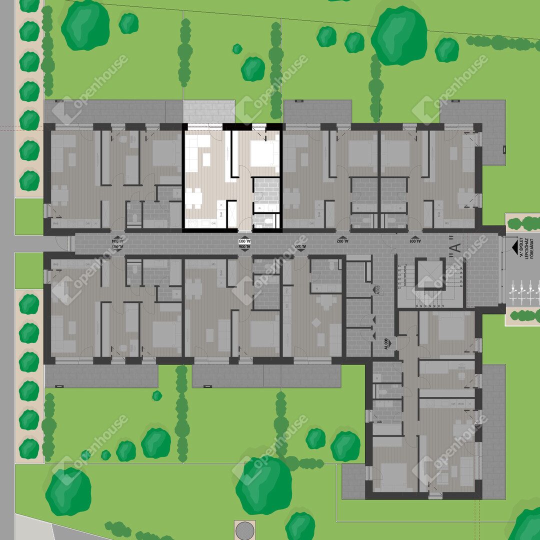 AL003 lakás: földszinti 42,47 m2 alapterületű, 1 szoba nappali elrendezésű, 5,87 m2 terasszal és 43,83 m2-es kertkapcsolattal.