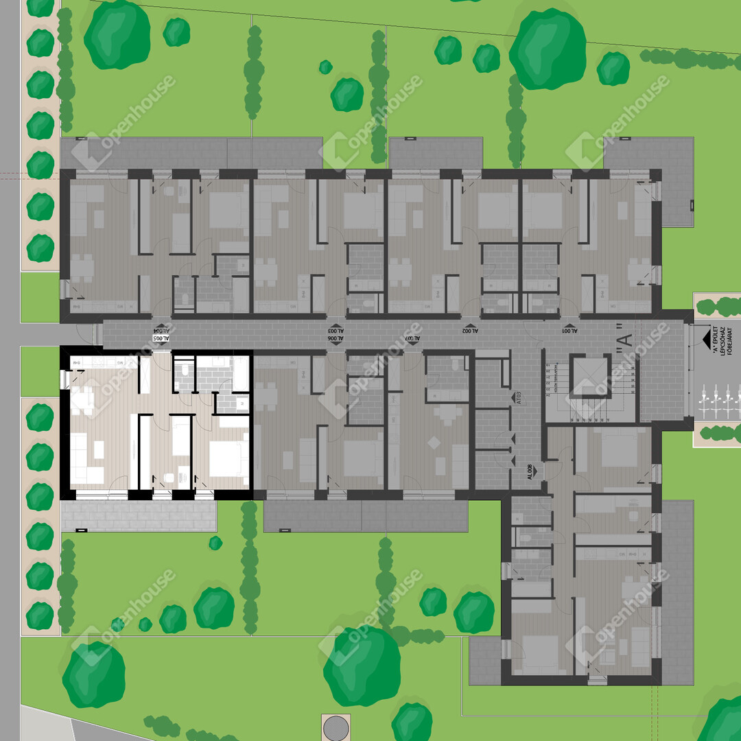 AL005 lakás: földszinti 58,52 m2 alapterületű, 2 szoba nappali elrendezésű, 12,8 m2 terasszal és 51,79 m2-es kertkapcsolattal.