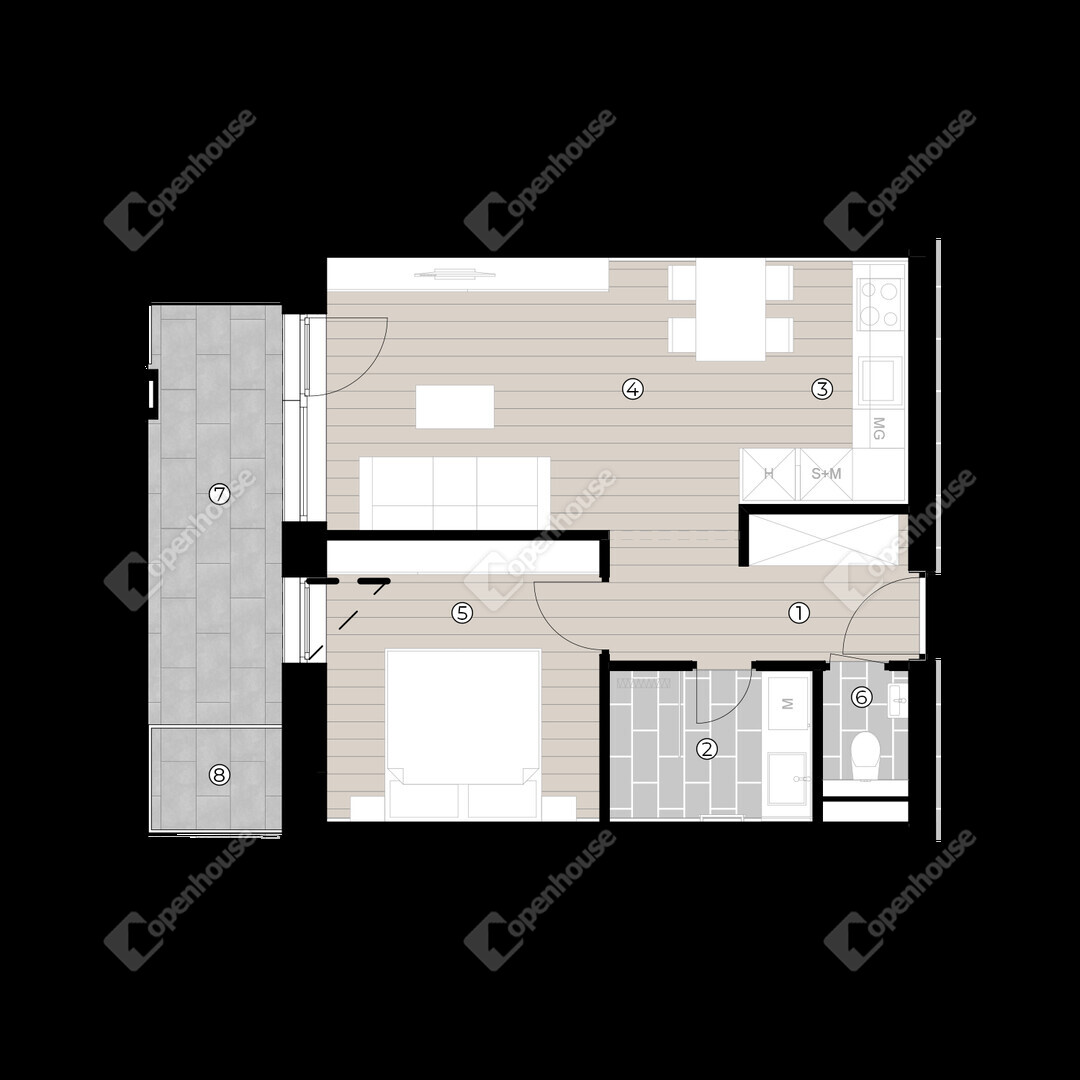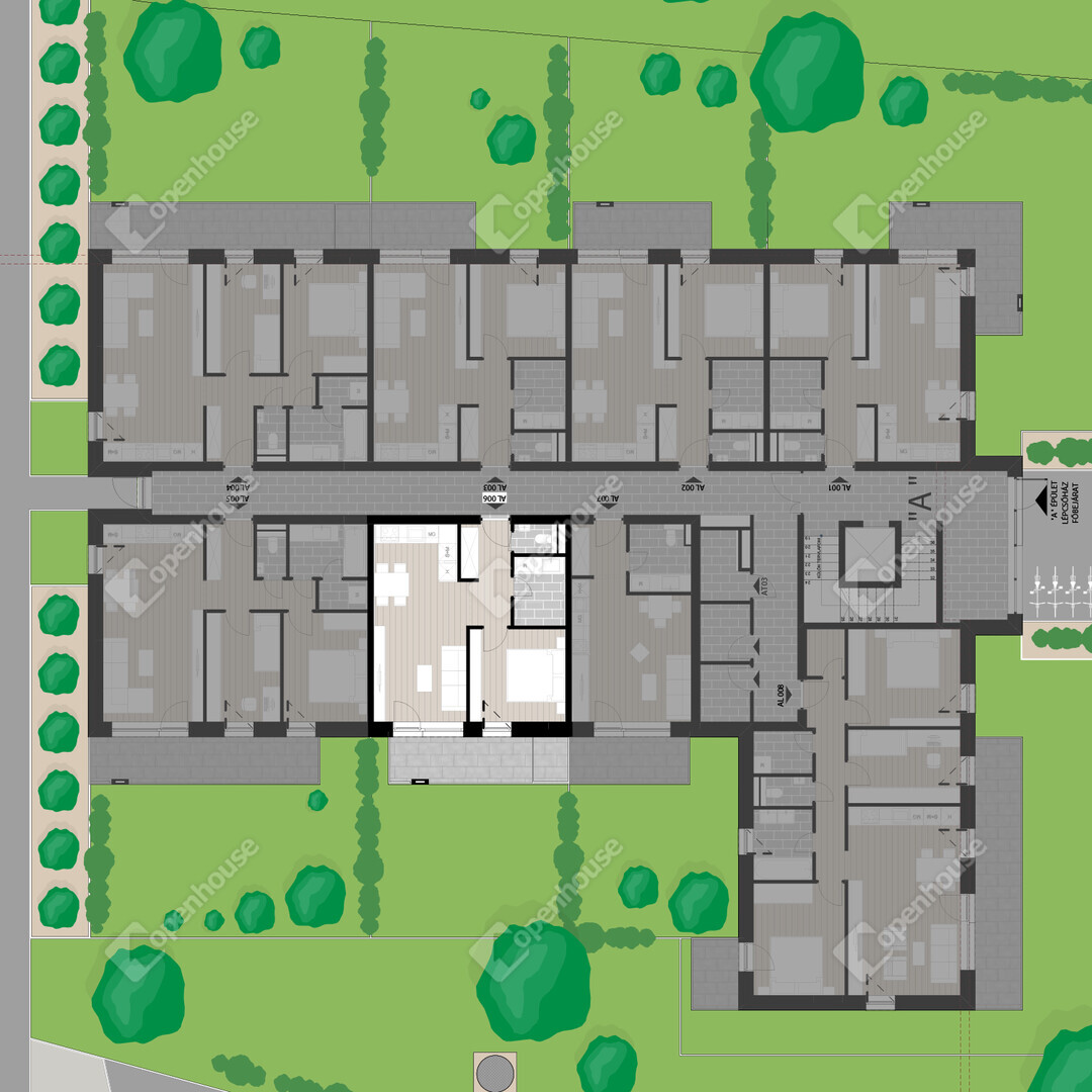 AL006 lakás: földszinti 42,47 m2 alapterületű, 1 szoba nappali elrendezésű, 8,07 m2 terasszal és 35,5 m2-es kertkapcsolattal.