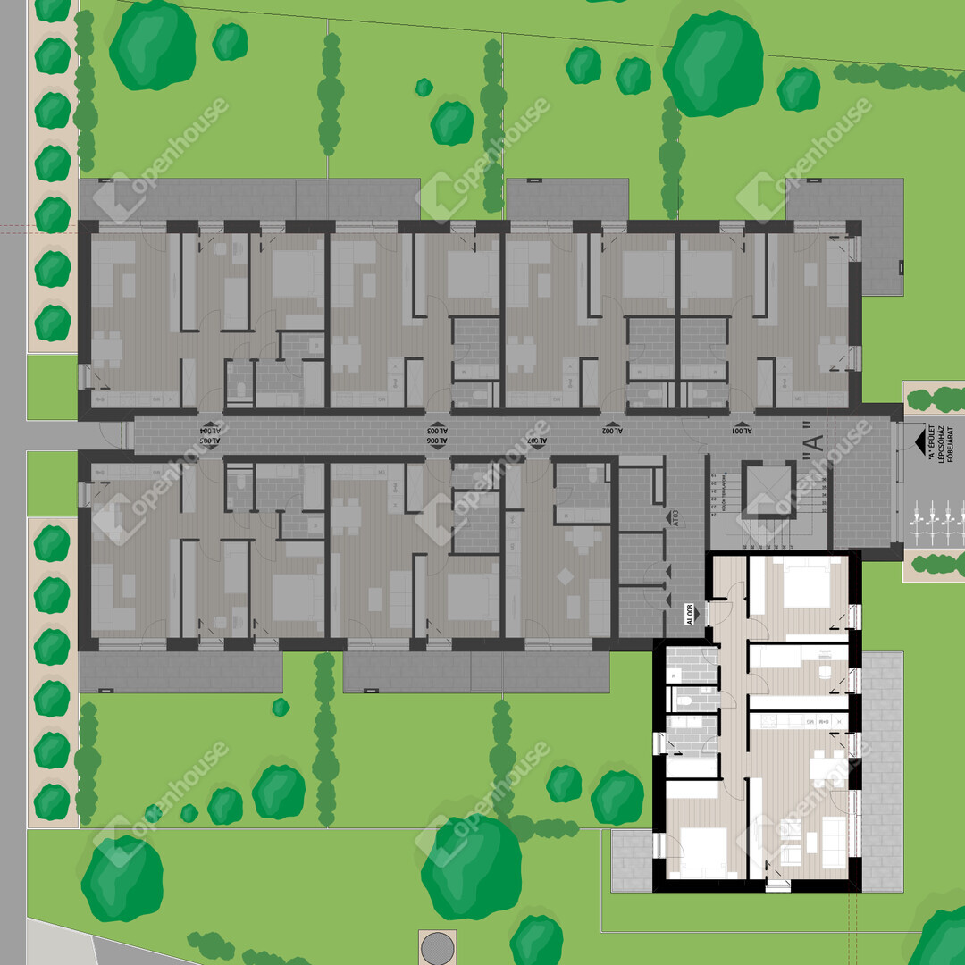 AL008 lakás: földszinti 78,84 m2 alapterületű, 3 szoba nappali elrendezésű, 18,94 m2 terasszal és 120,35 m2-es kertkapcsolattal.