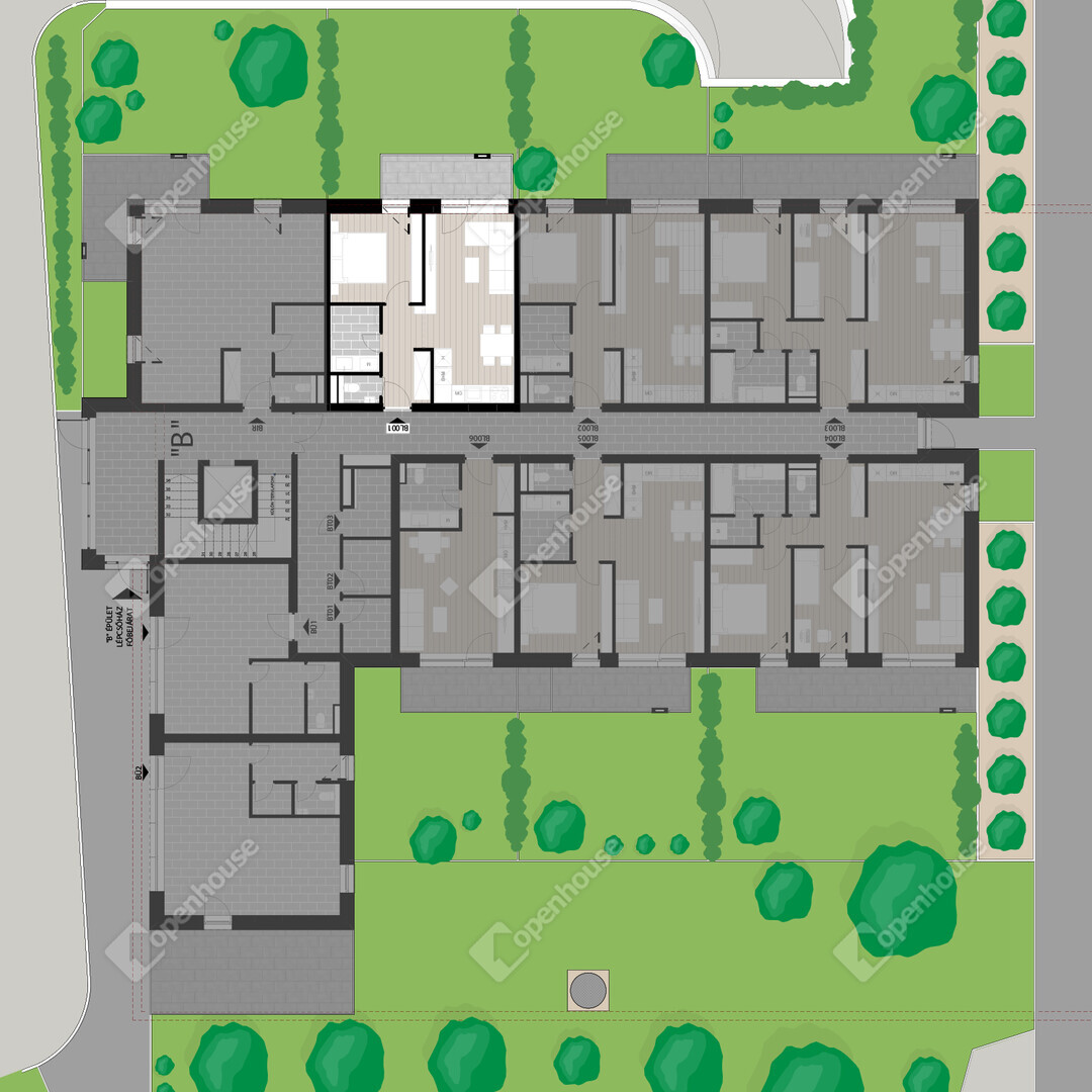 BL001 lakás: földszinti 42,47 m2 alapterületű, 1 szoba nappali elrendezésű, 7,68 m2 terasszal és 37,07 m2-es kertkapcsolattal.