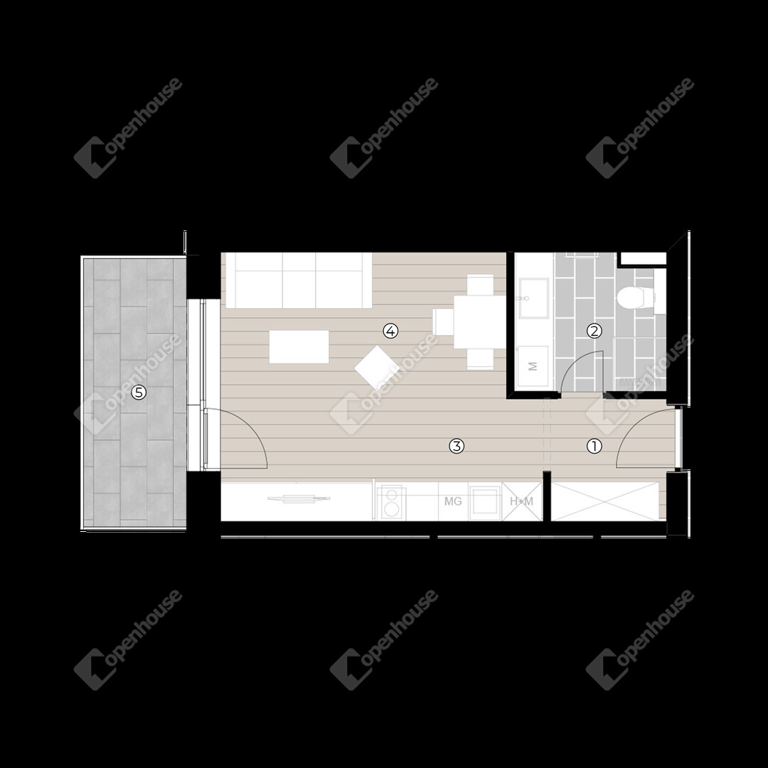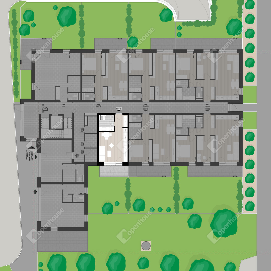 BL006 lakás: földszinti 26,94 m2 alapterületű garzon, 6,76 m2 terasszal és 32,41 m2-es kertkapcsolattal.