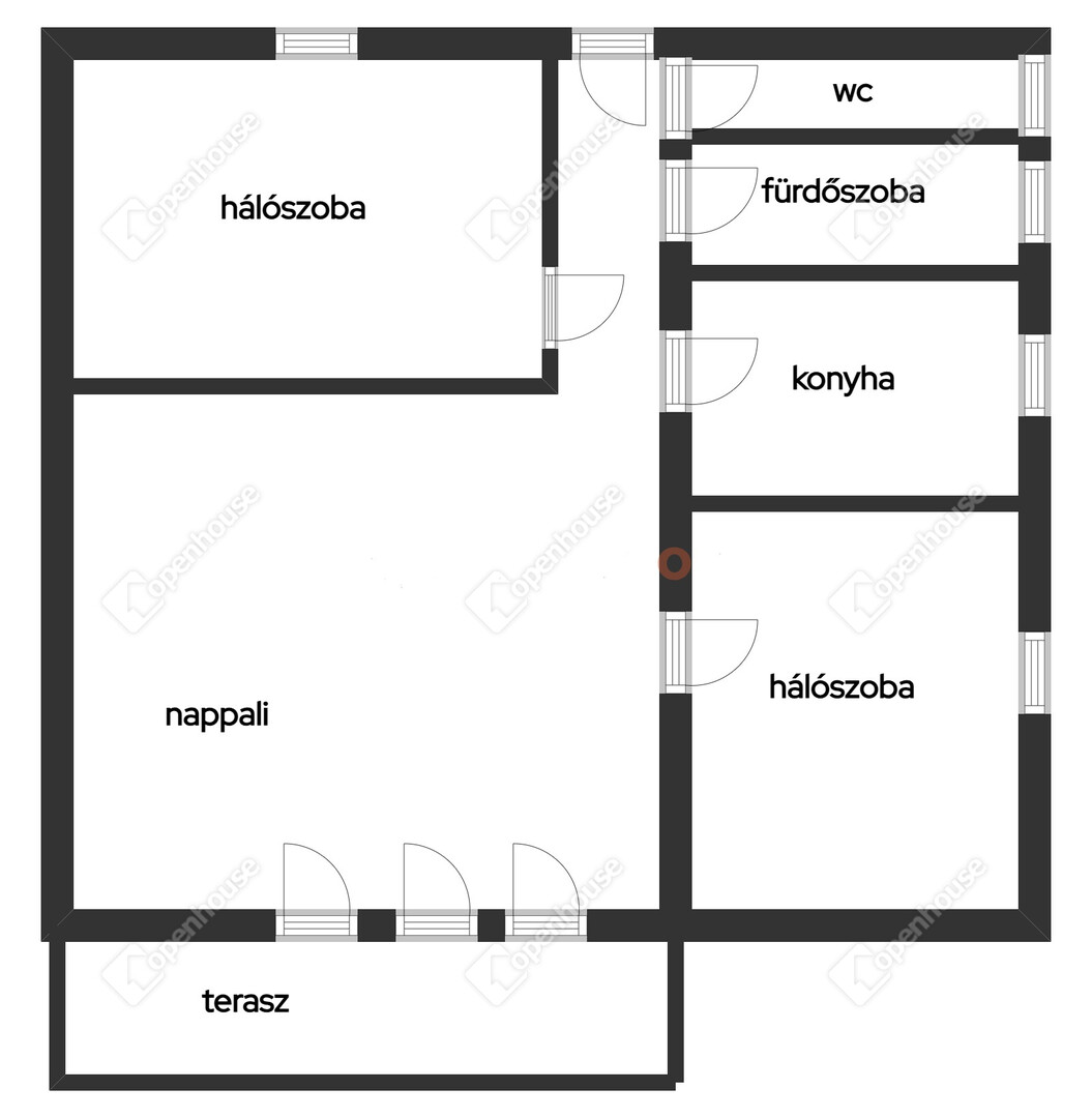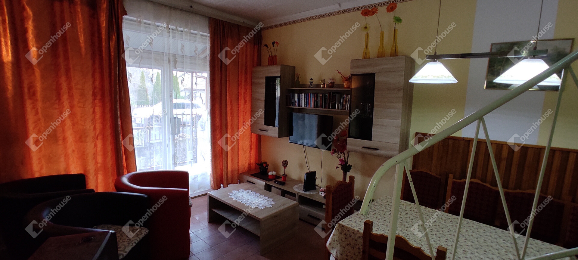 A bejáratnál nagyméretű teraszról lehet belépni az ingatlanba, ahol nappali, két hálószoba, konyha, fürdőszoba és külön wc található.