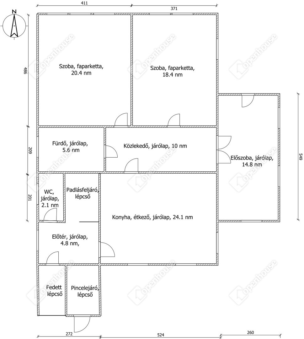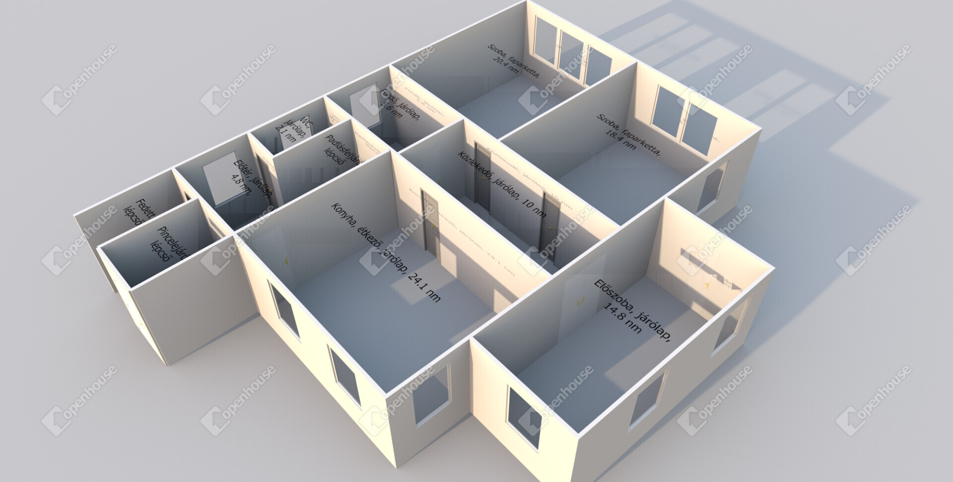 Szobákban faparketta burkolat, a többi helyiségben járólap található.