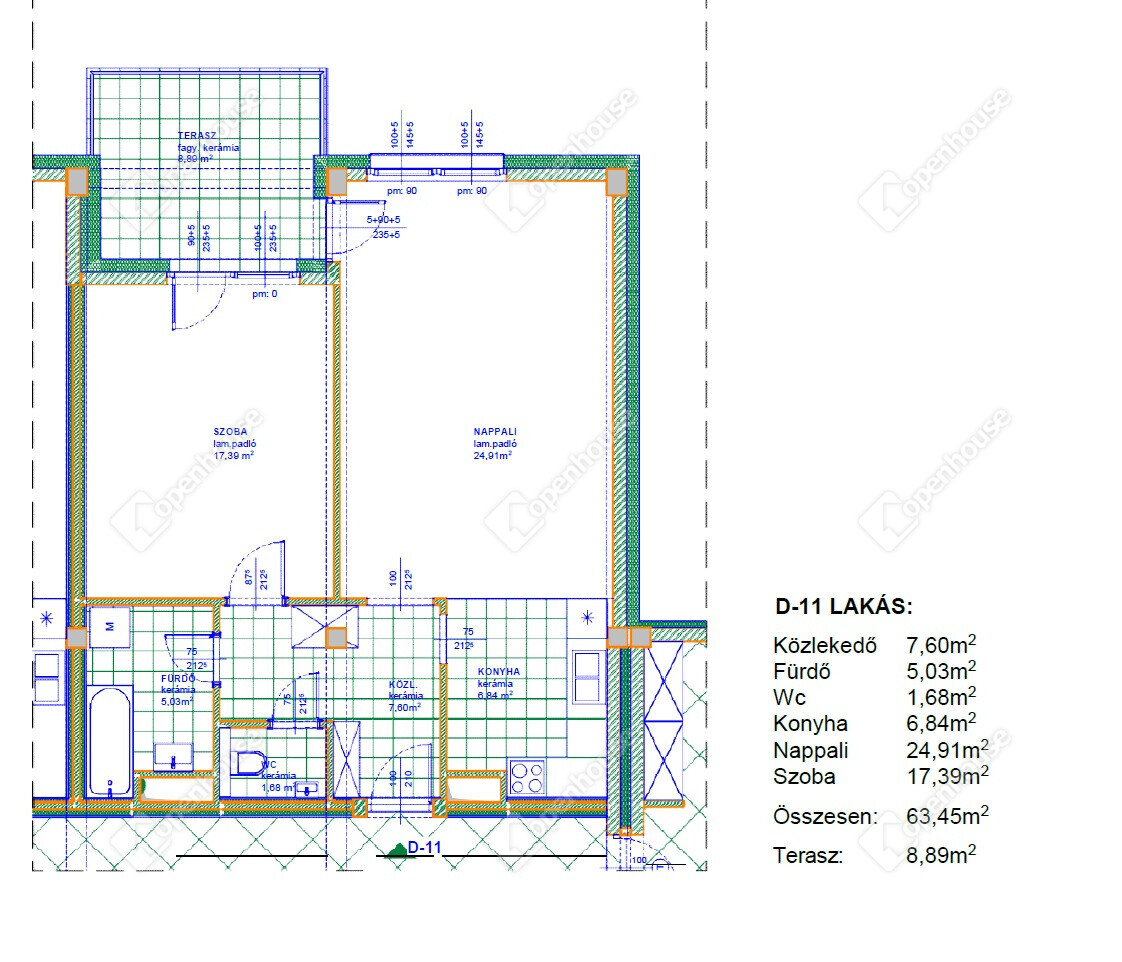 - Lakások Paraméterei: Nappali + 1 szoba 63m2-en, Nappali + 2 szoba 77 m2-en, Nappali + 2 szoba 100 m2-en 33 m2-es terasszal. Minden lakáshoz nagy alapterületű félig nyitott, félig zárt erkély tartozik, a földszinti lakások pedig kertkapcsolatosak.