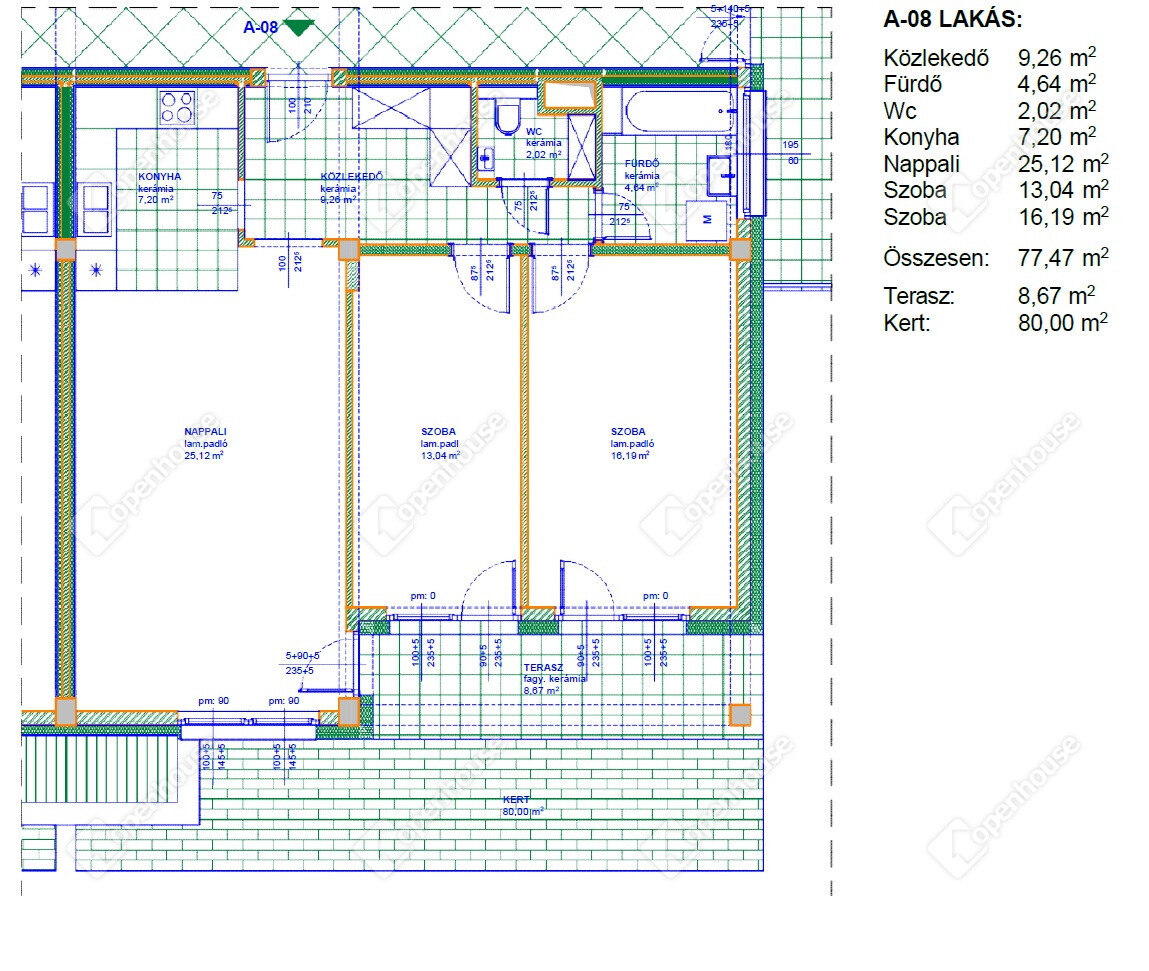 - Lakások Paraméterei: Nappali + 1 szoba 63m2-en, Nappali + 2 szoba 77 m2-en, Nappali + 2 szoba 100 m2-en 33 m2-es terasszal. Minden lakáshoz nagy alapterületű félig nyitott, félig zárt erkély tartozik, a földszinti lakások pedig kertkapcsolatosak.