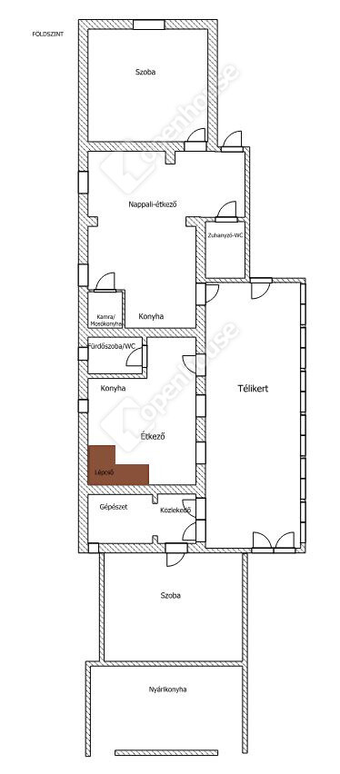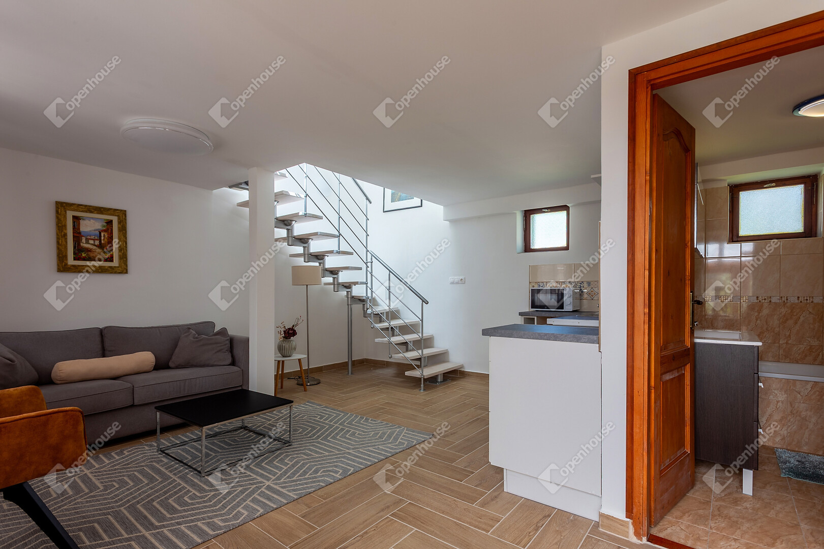 *További helyiségek: közös konyha feljárattal az emeletre, fürdőszoba WC-vel, közlekedő, szoba, gépészet